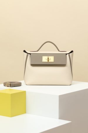 The 24/24 shares some unmistakable DNA with the Birkin and Kelly—a trapezoidal shape, rounded top handle, and signature turn-lock closure.