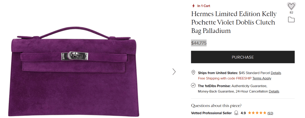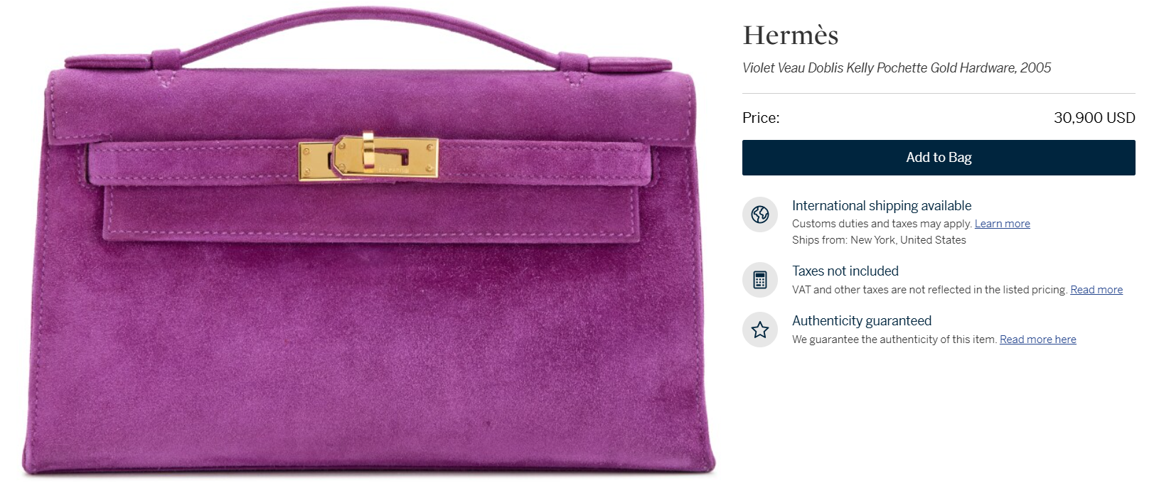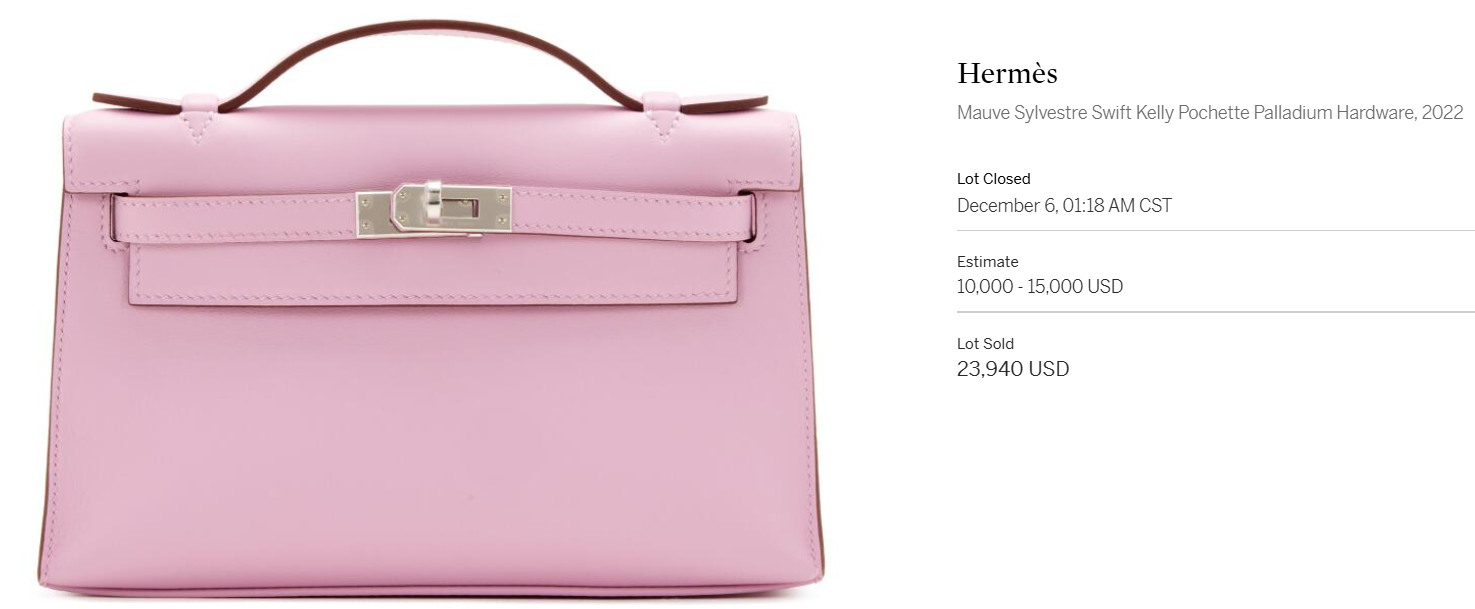 For example, in December 2022, a brand-new Mauve Sylvestre Swift leather Kelly Pochette with palladium hardware was sold at Sotheby’s for $23,940—about four times its retail price.