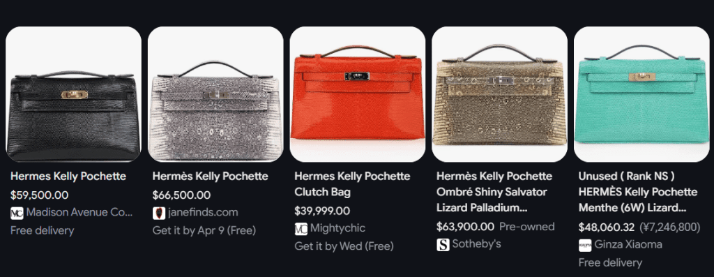 Similar to other Hermes bags, crocodile, lizard, and ostrich versions of the Kelly Pochette are less in demand than the regular leather ones. That means their premiums are generally lower.