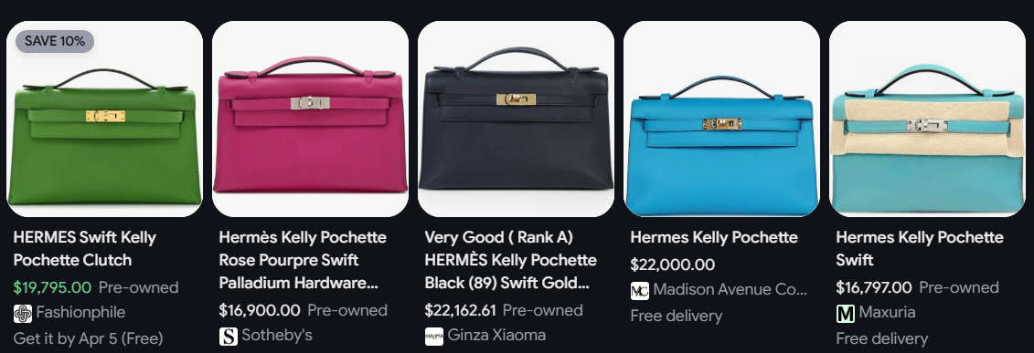 On the resale market, you can find a new Swift leather Kelly Pochette selling for anywhere from three to four times the retail price. Some colors command even higher prices.