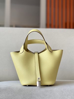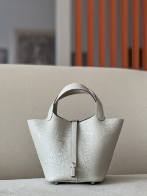 The Hermès Picotin is an elevated bucket bag. Open top design for easy access. Leather tab and H lock for closure. Four stud feet on the bottom so it won’t scratch.