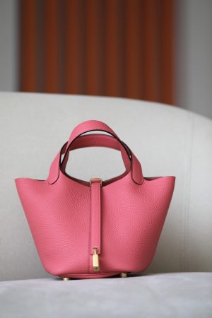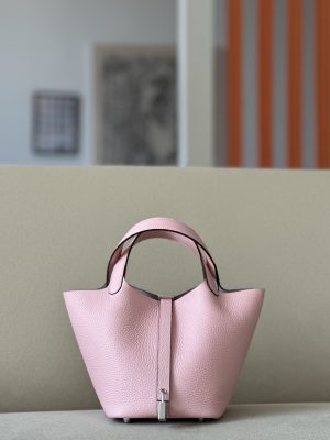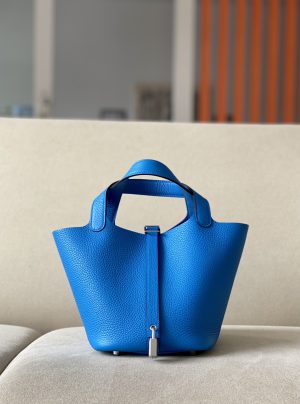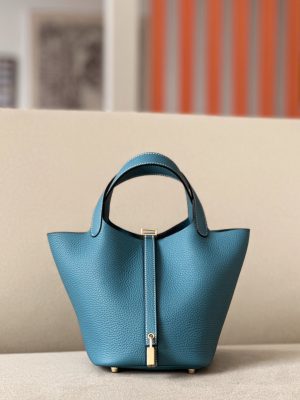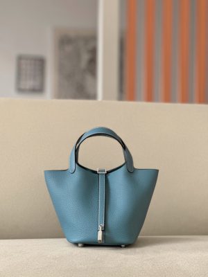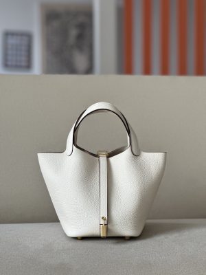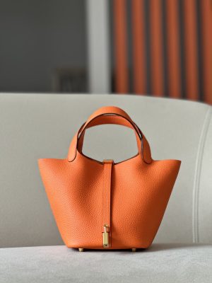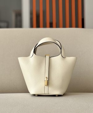 The Hermès Picotin is an elevated bucket bag. Open top design for easy access. Leather tab and H lock for closure. Four stud feet on the bottom so it won’t scratch.
