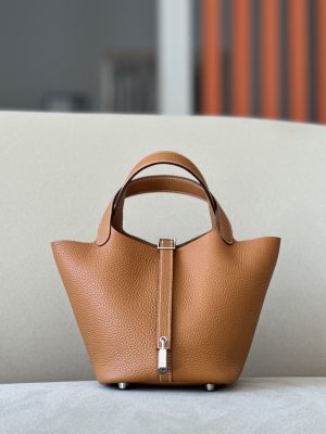 The Hermès Picotin is an elevated bucket bag. Open top design for easy access. Leather tab and H lock for closure. Four stud feet on the bottom so it won’t scratch.