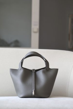 The Hermès Picotin is an elevated bucket bag. Open top design for easy access. Leather tab and H lock for closure. Four stud feet on the bottom so it won’t scratch.