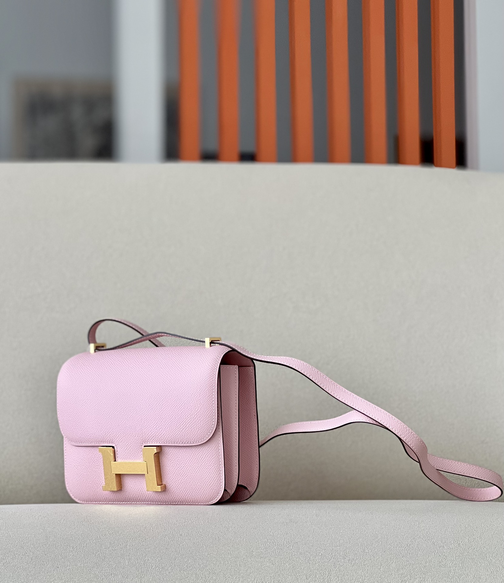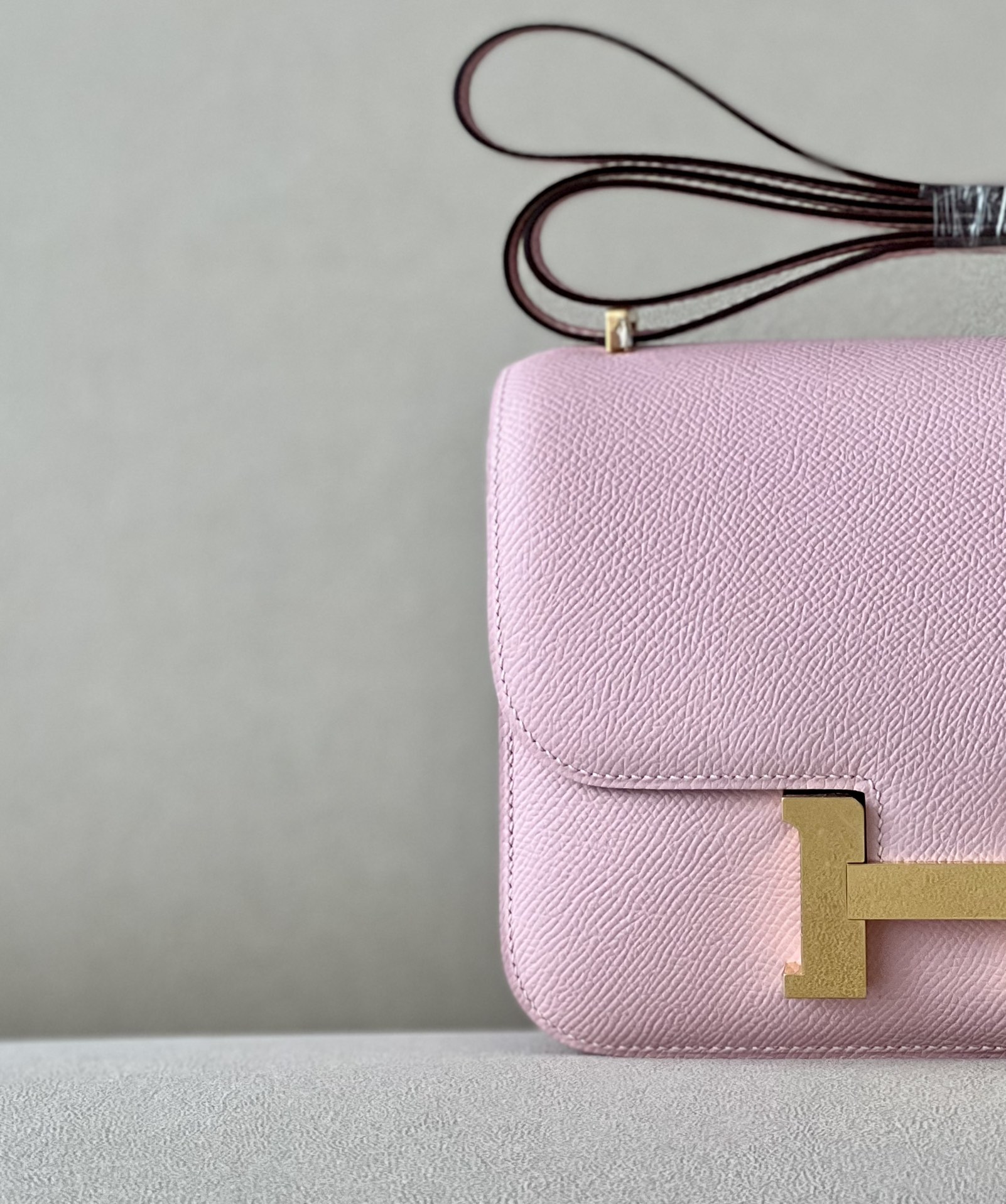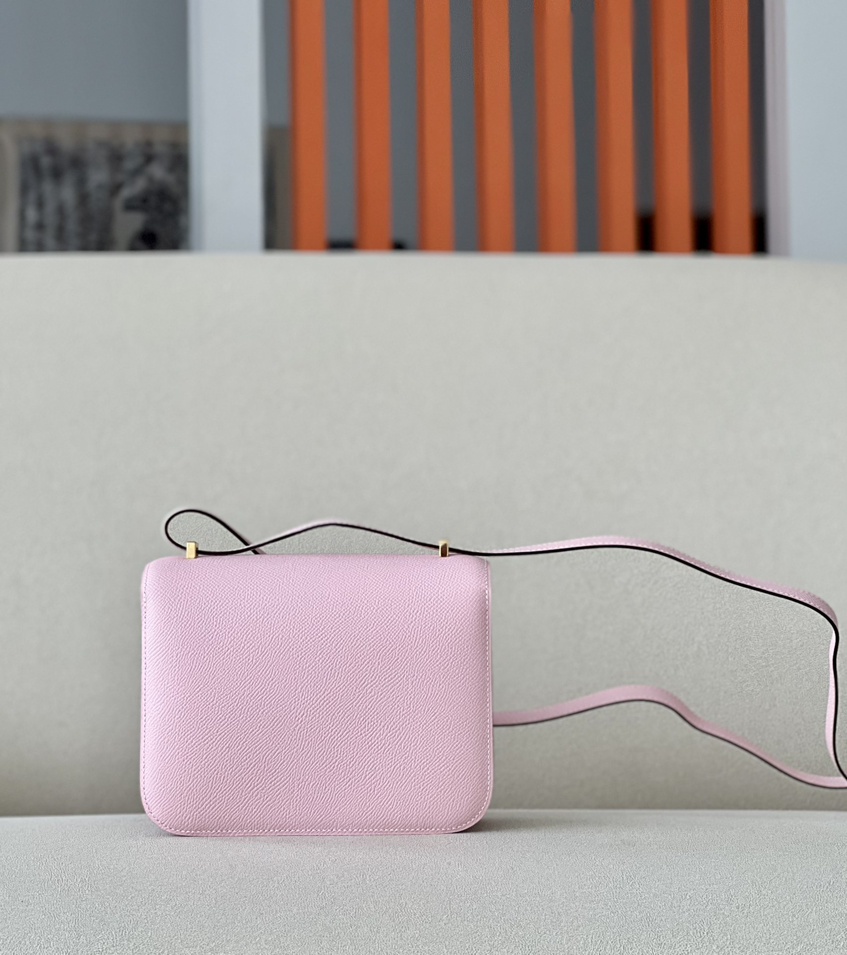 The bag features a long shoulder strap , including an H buckle on the flap.