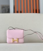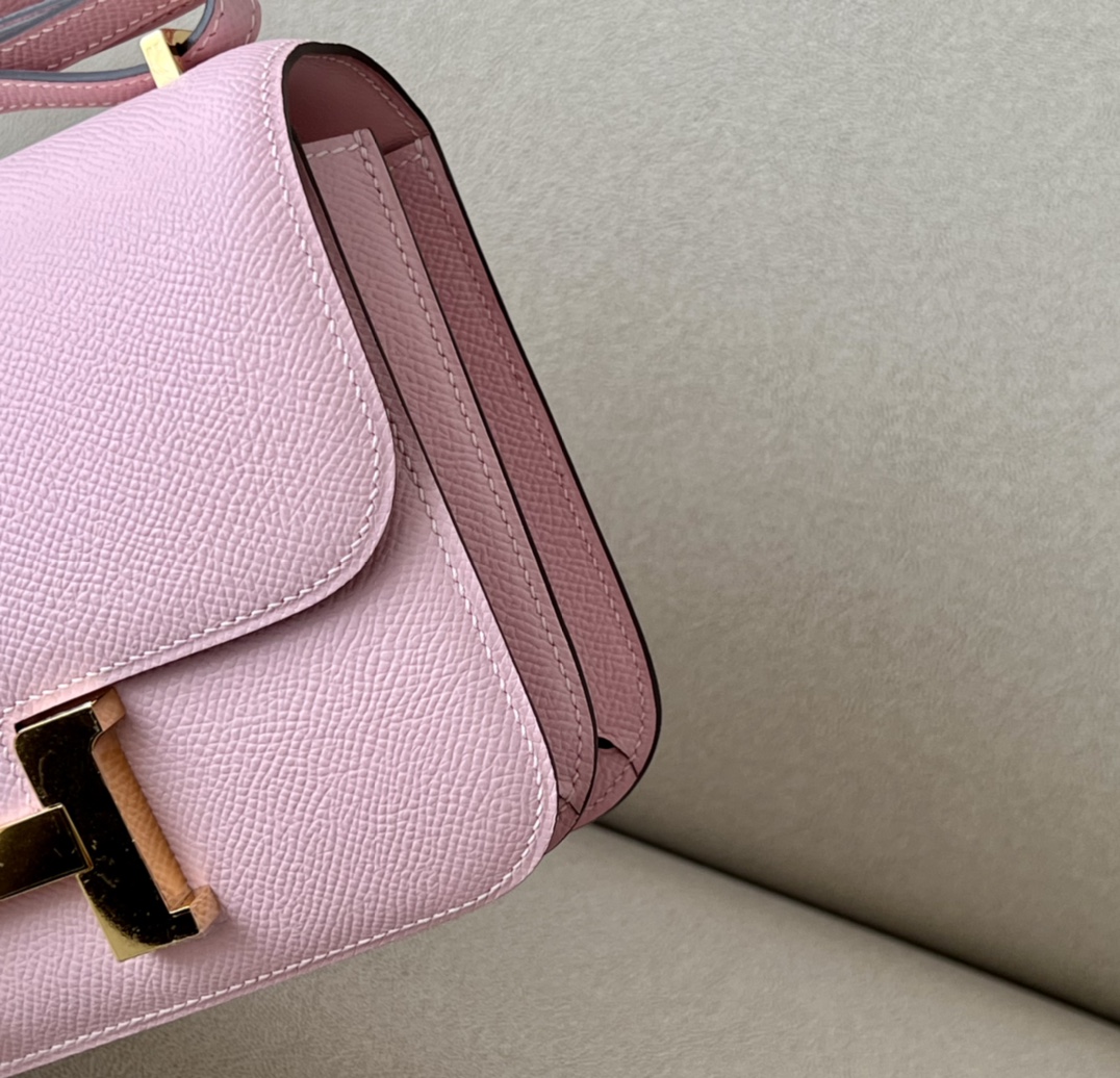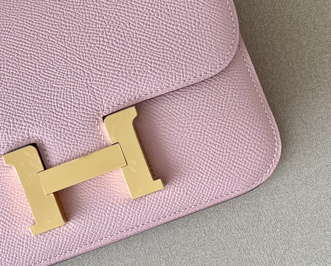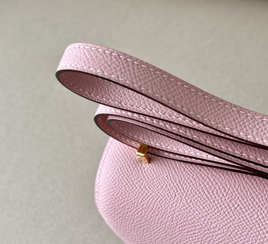 The bag features a long shoulder strap , including an H buckle on the flap.