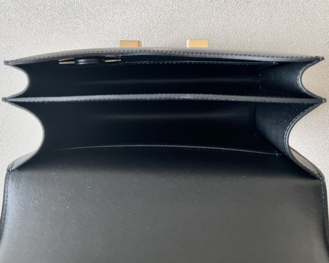Lining in leather, two compartments, one patch pocket.