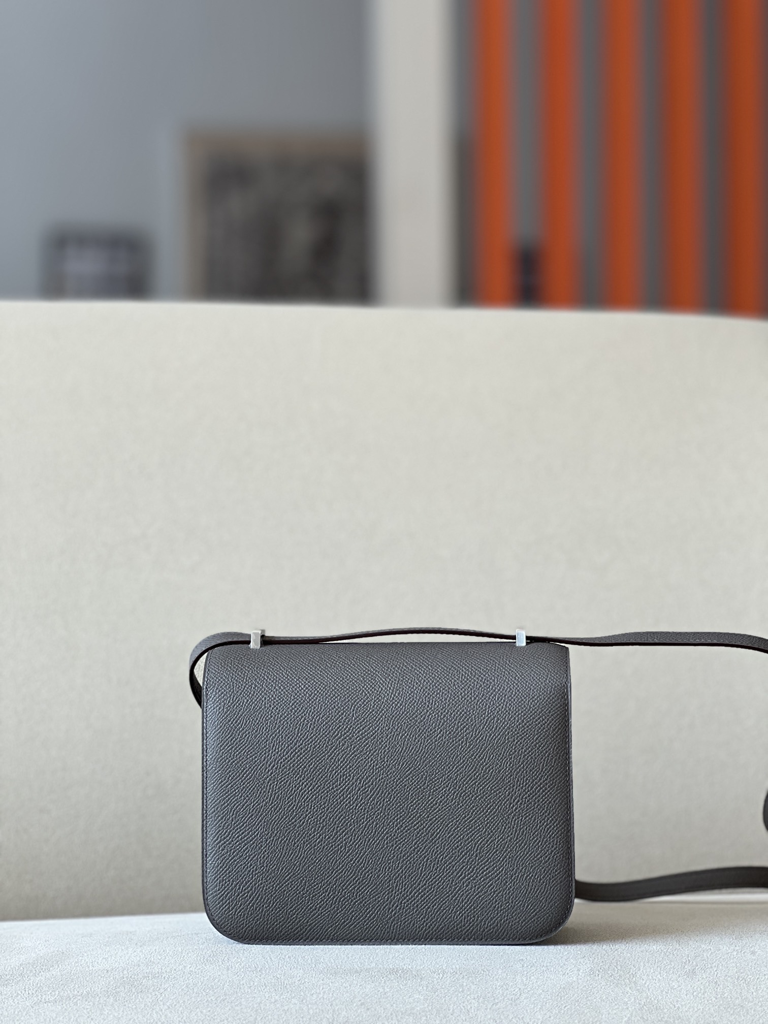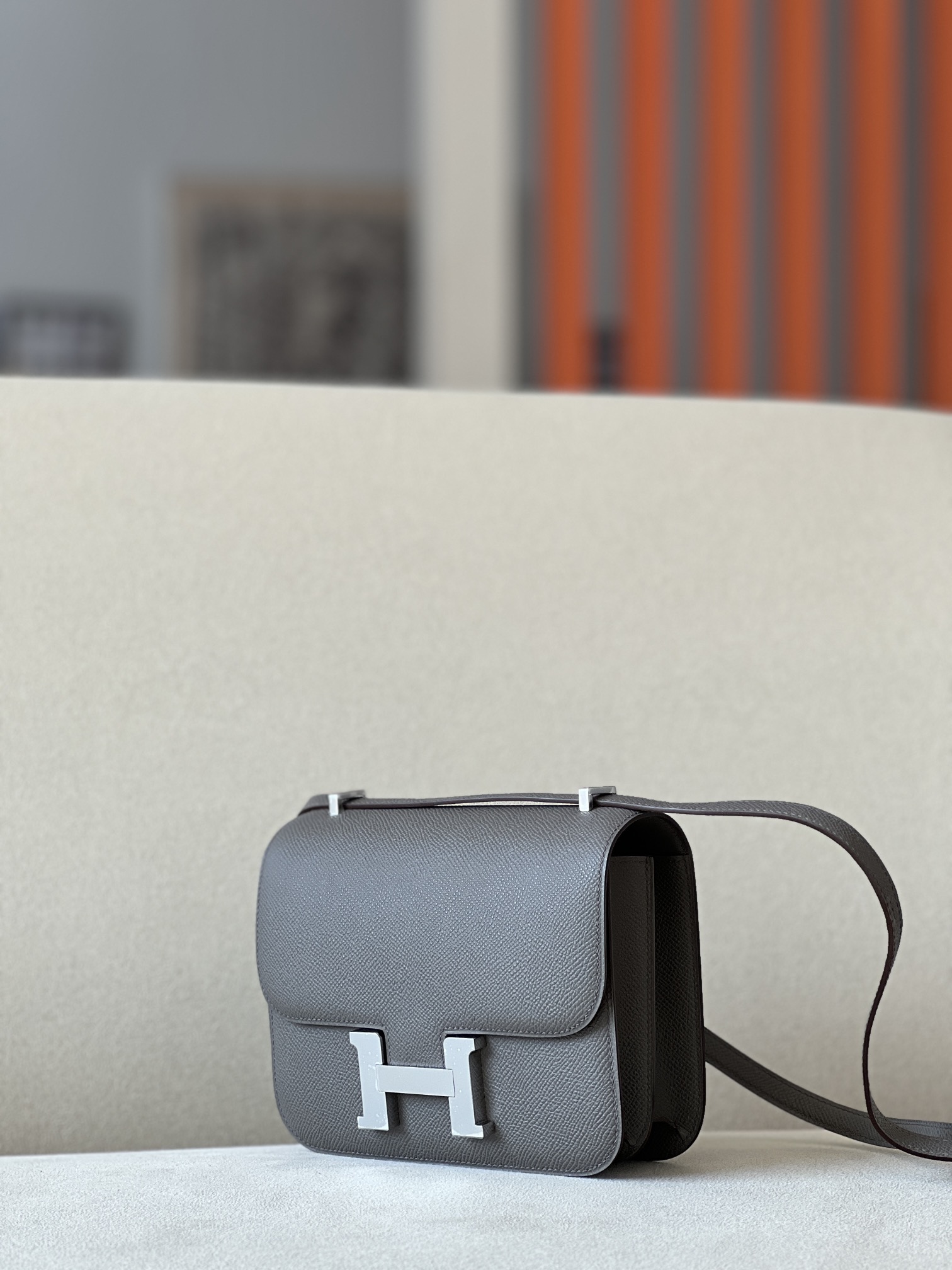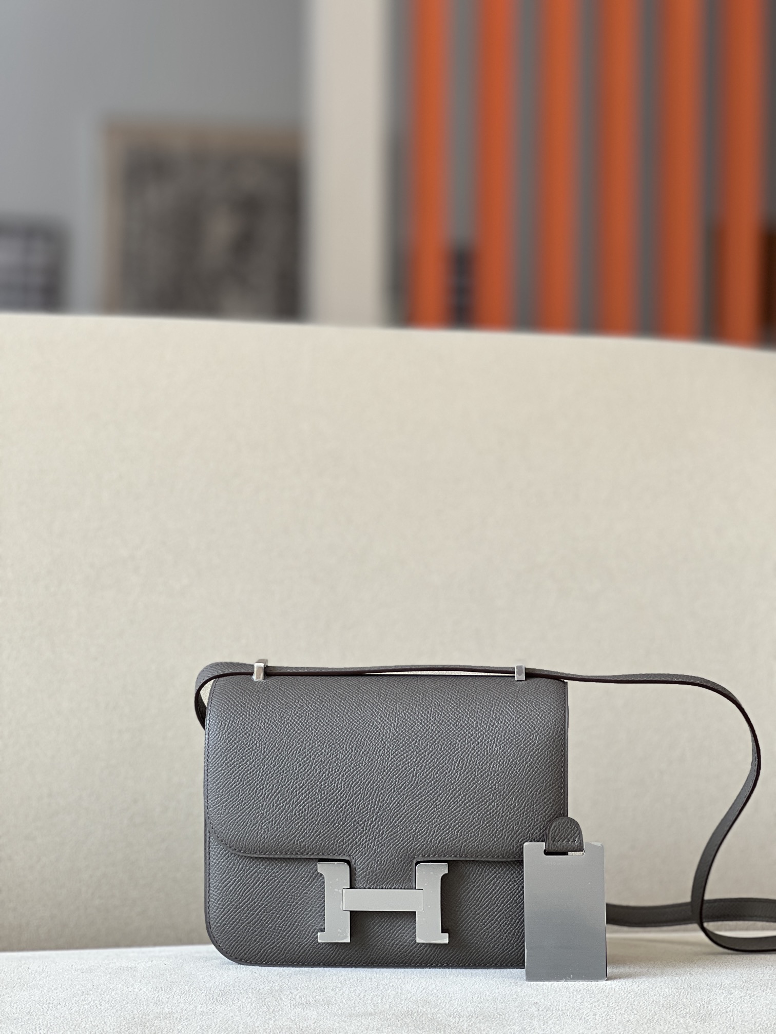 The bag features a long shoulder strap , including an H buckle on the flap.