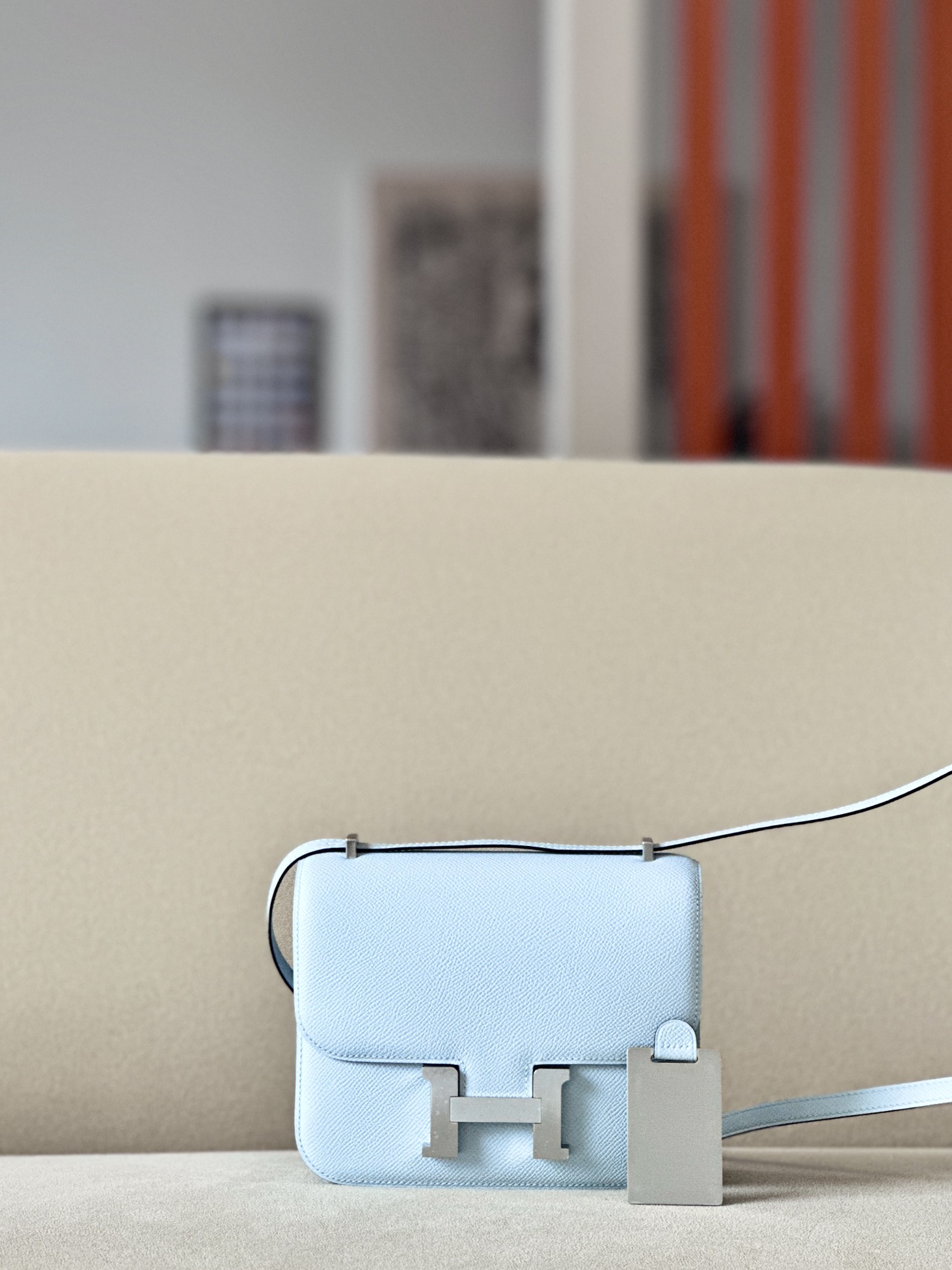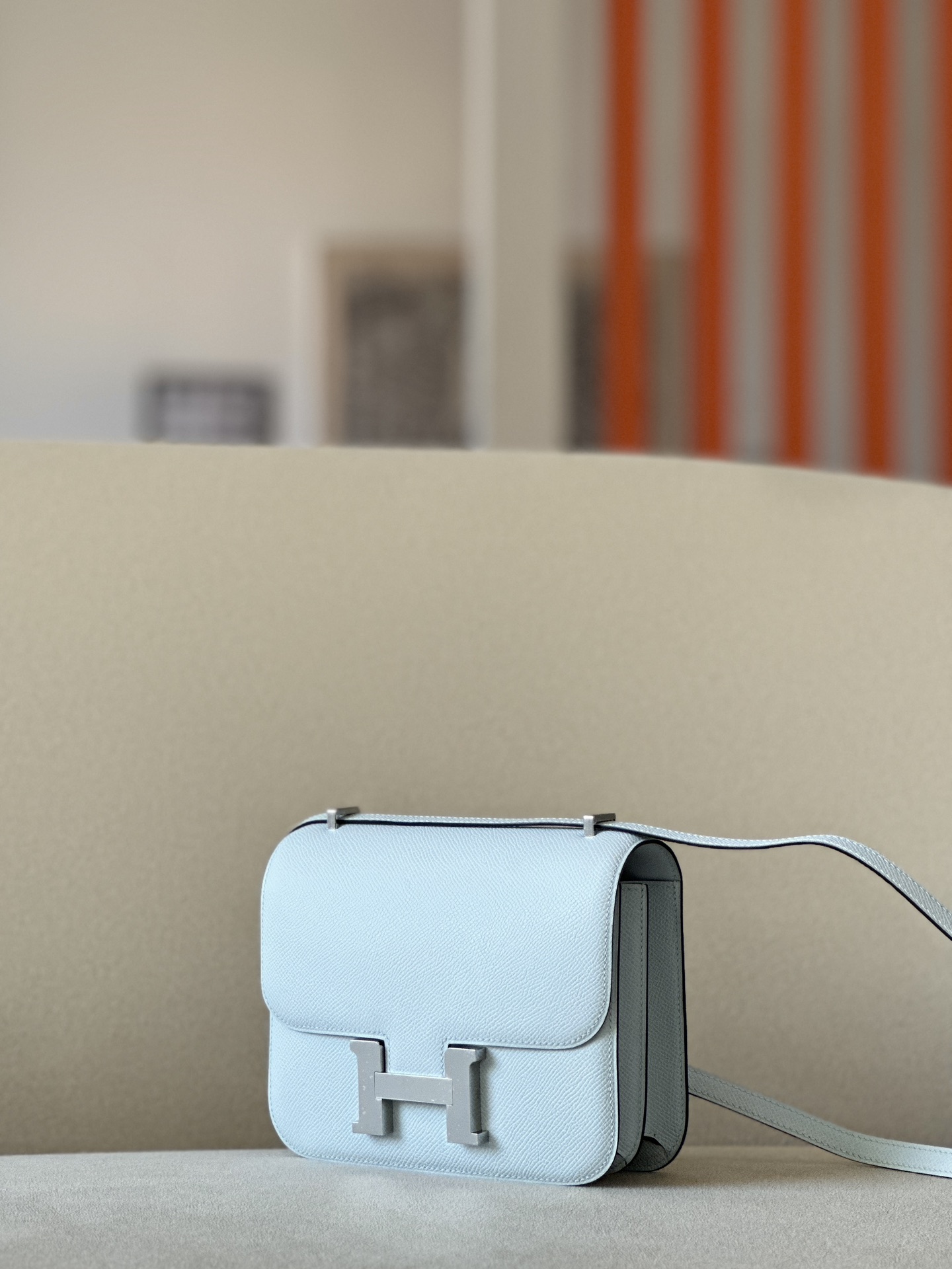 The bag features a long shoulder strap , including an H buckle on the flap.
