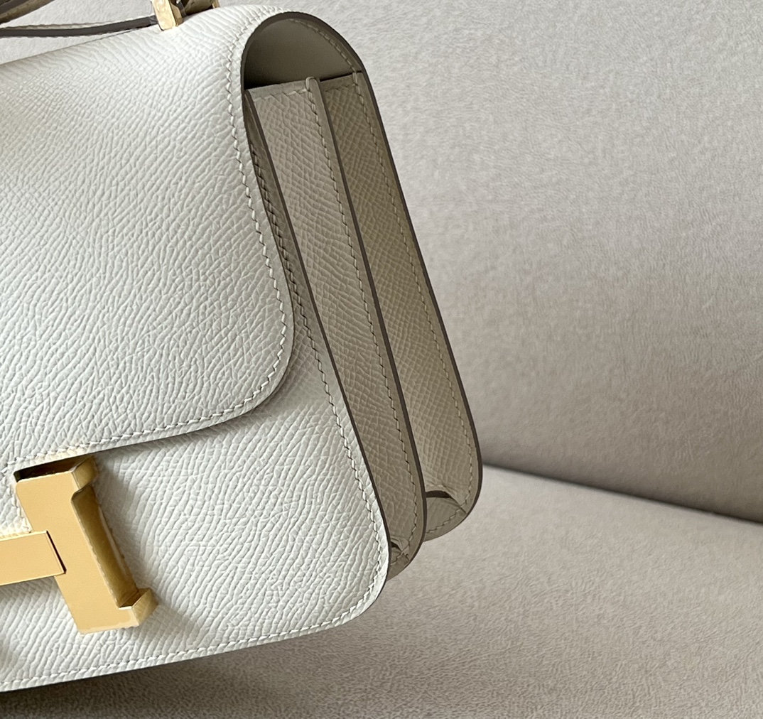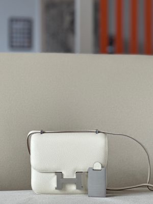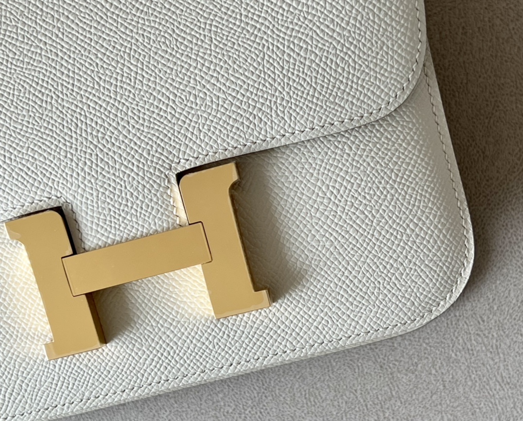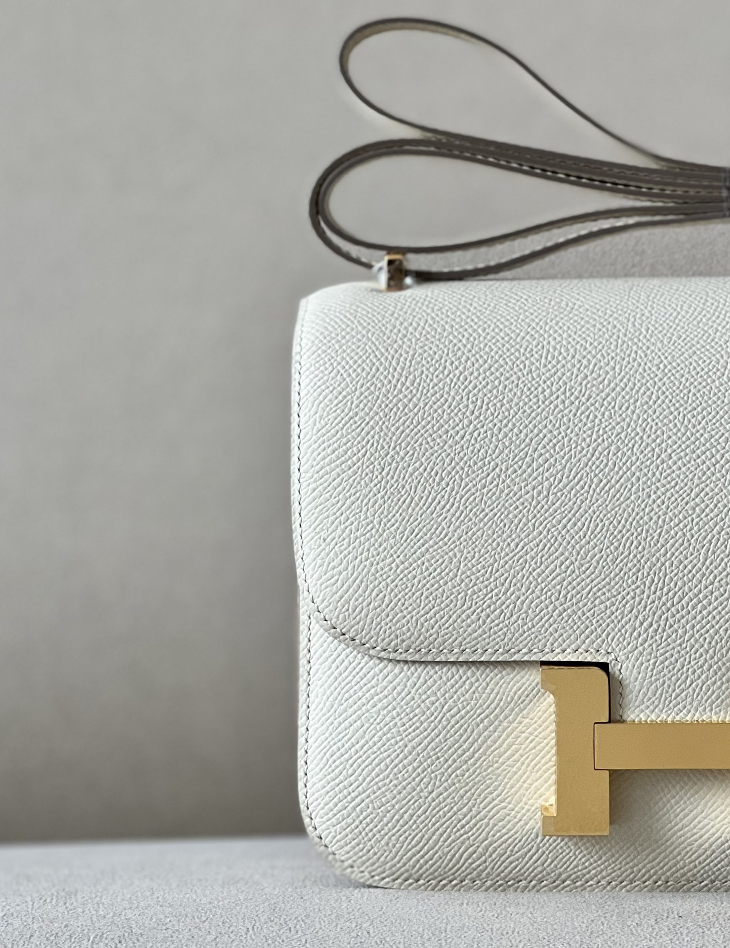 The bag features a long shoulder strap , including an H buckle on the flap.