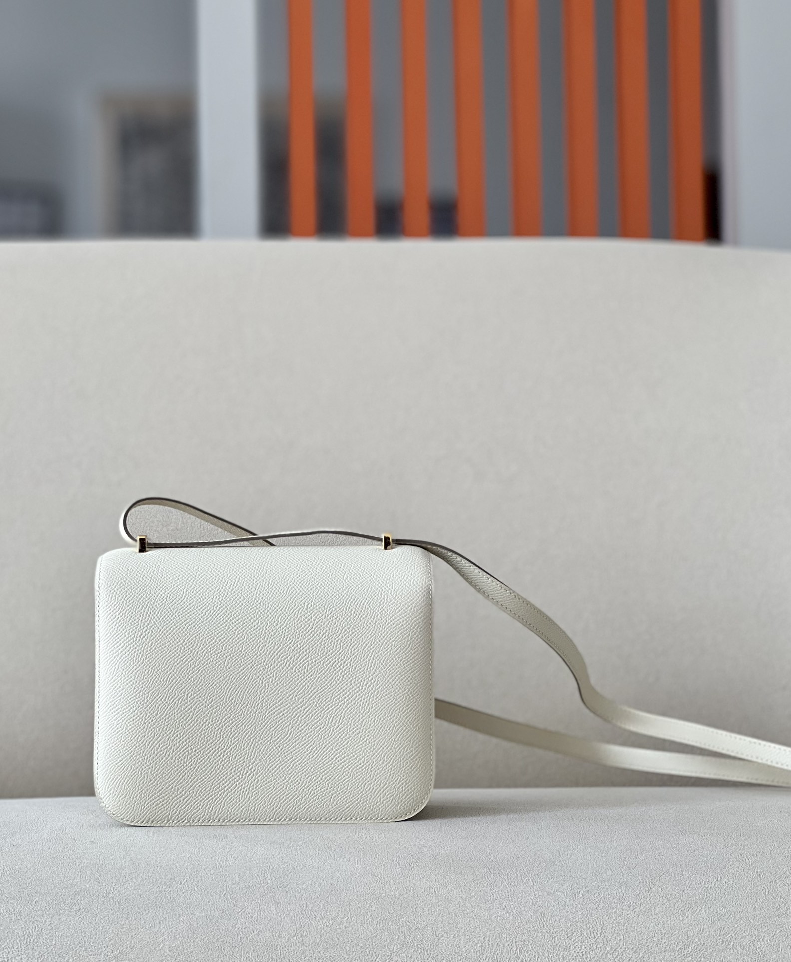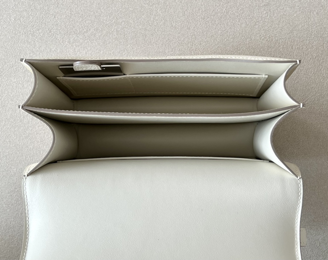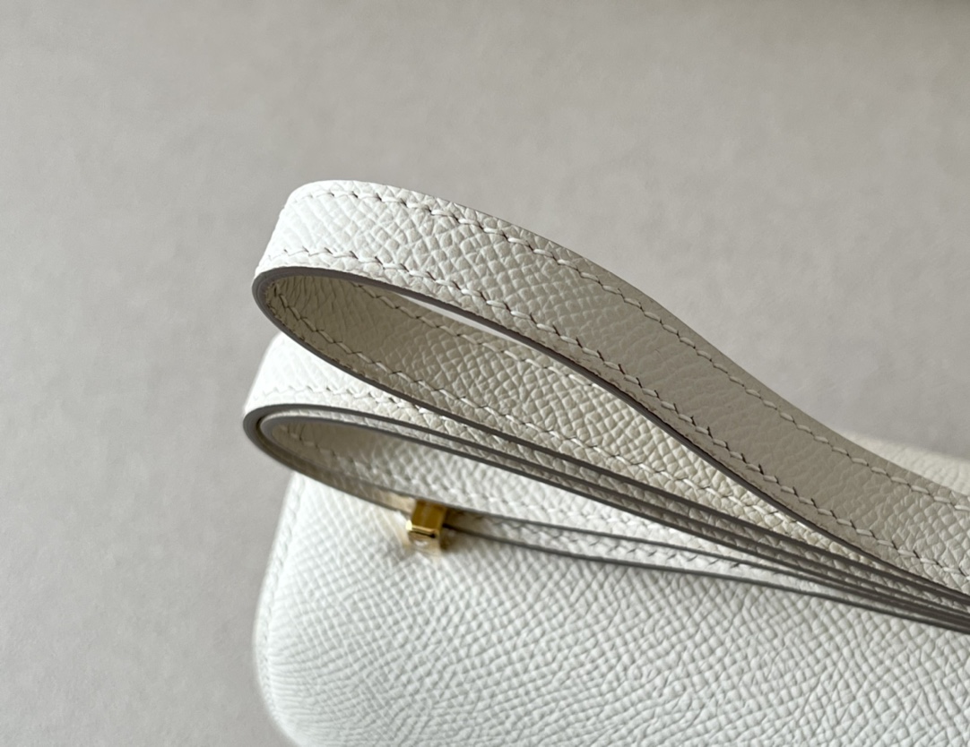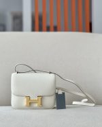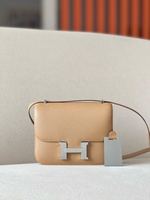The bag features a long shoulder strap , including an H buckle on the flap.