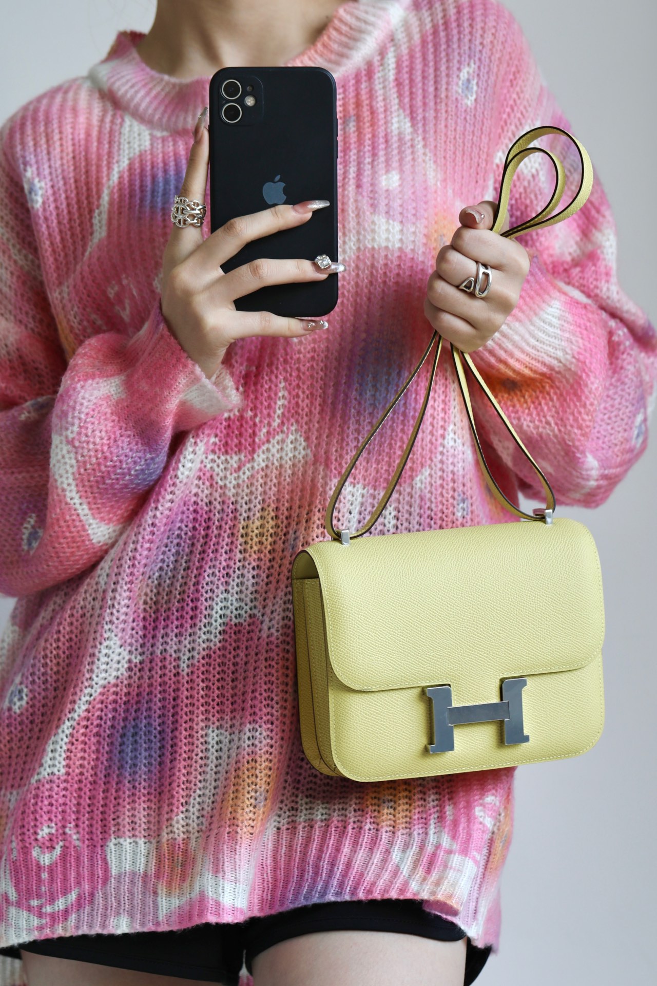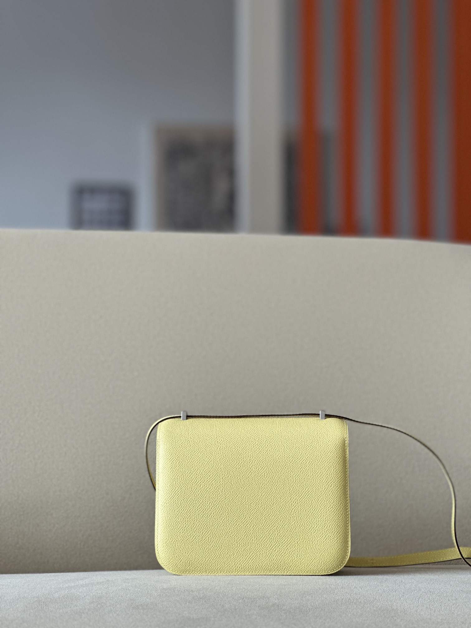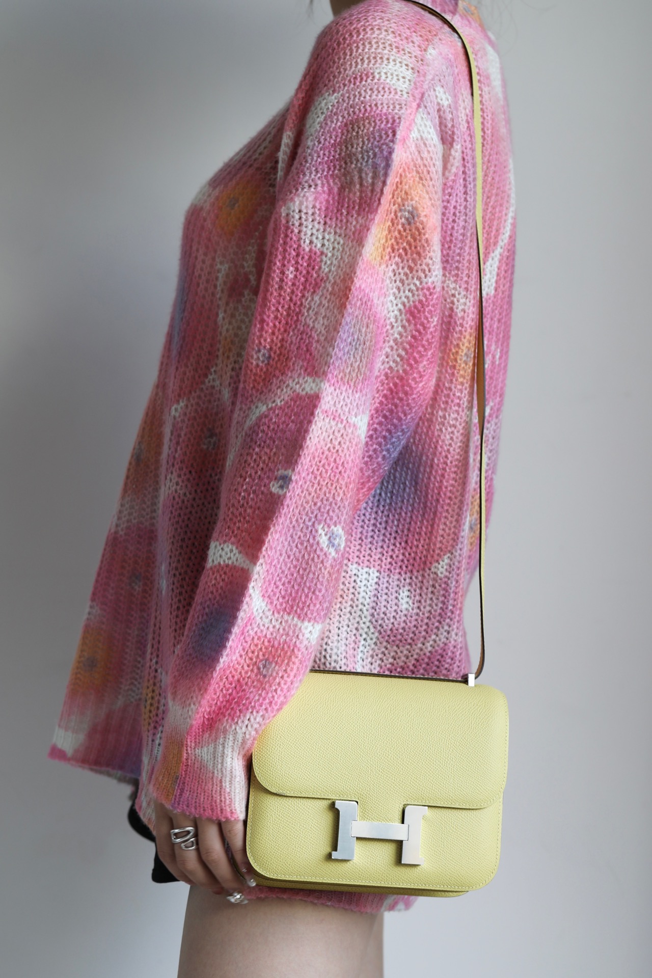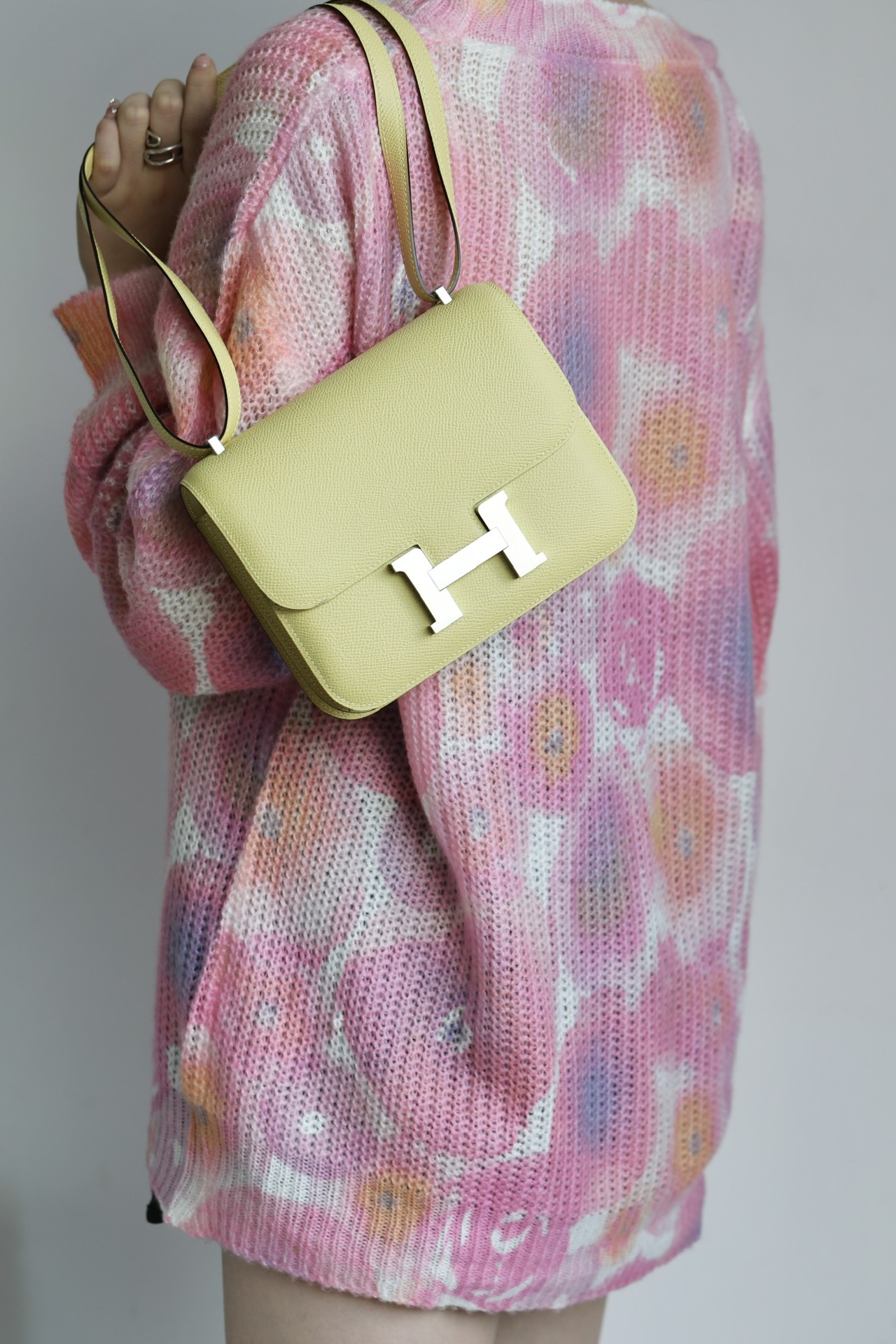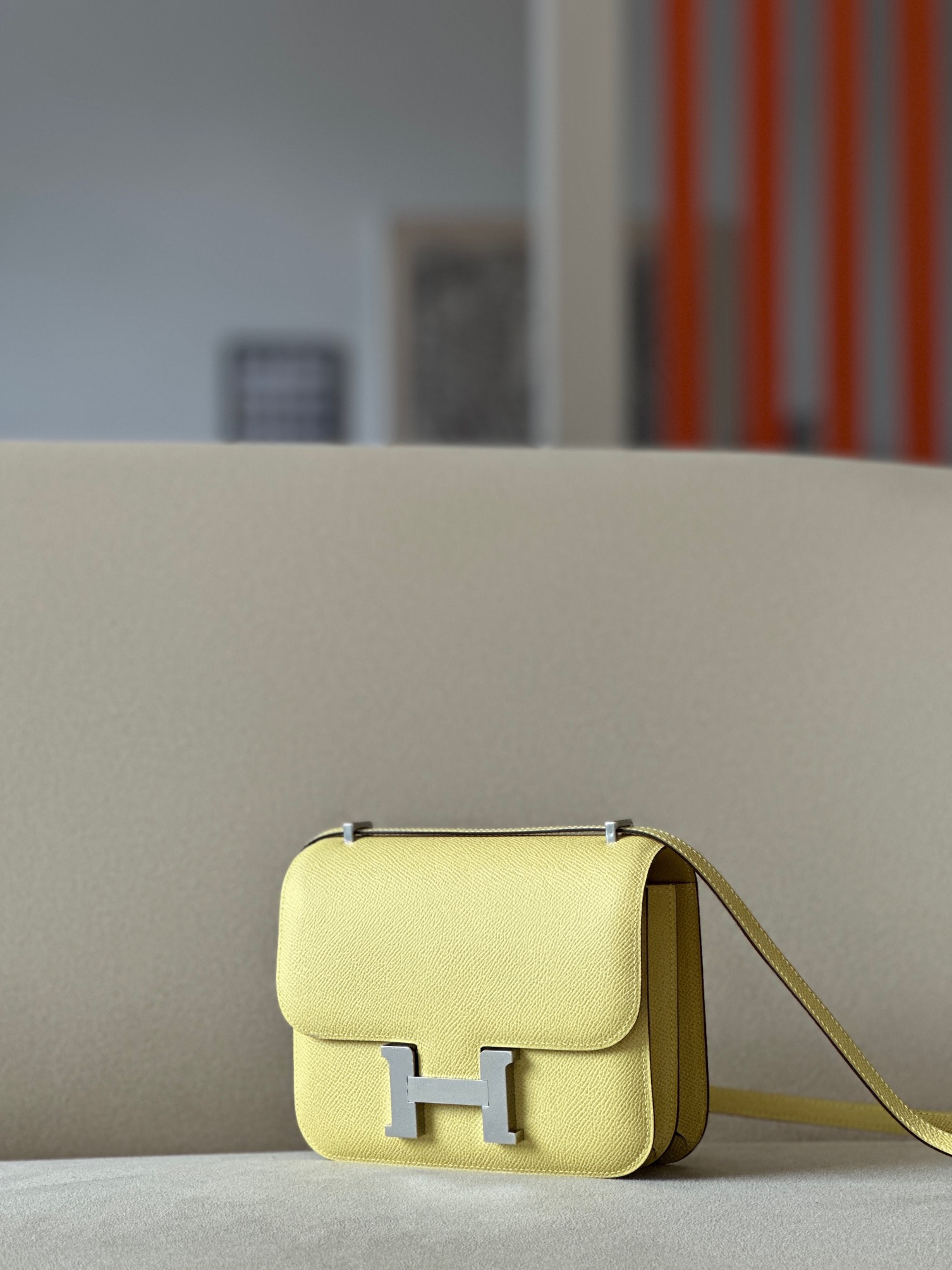 The bag features a long shoulder strap , including an H buckle on the flap.