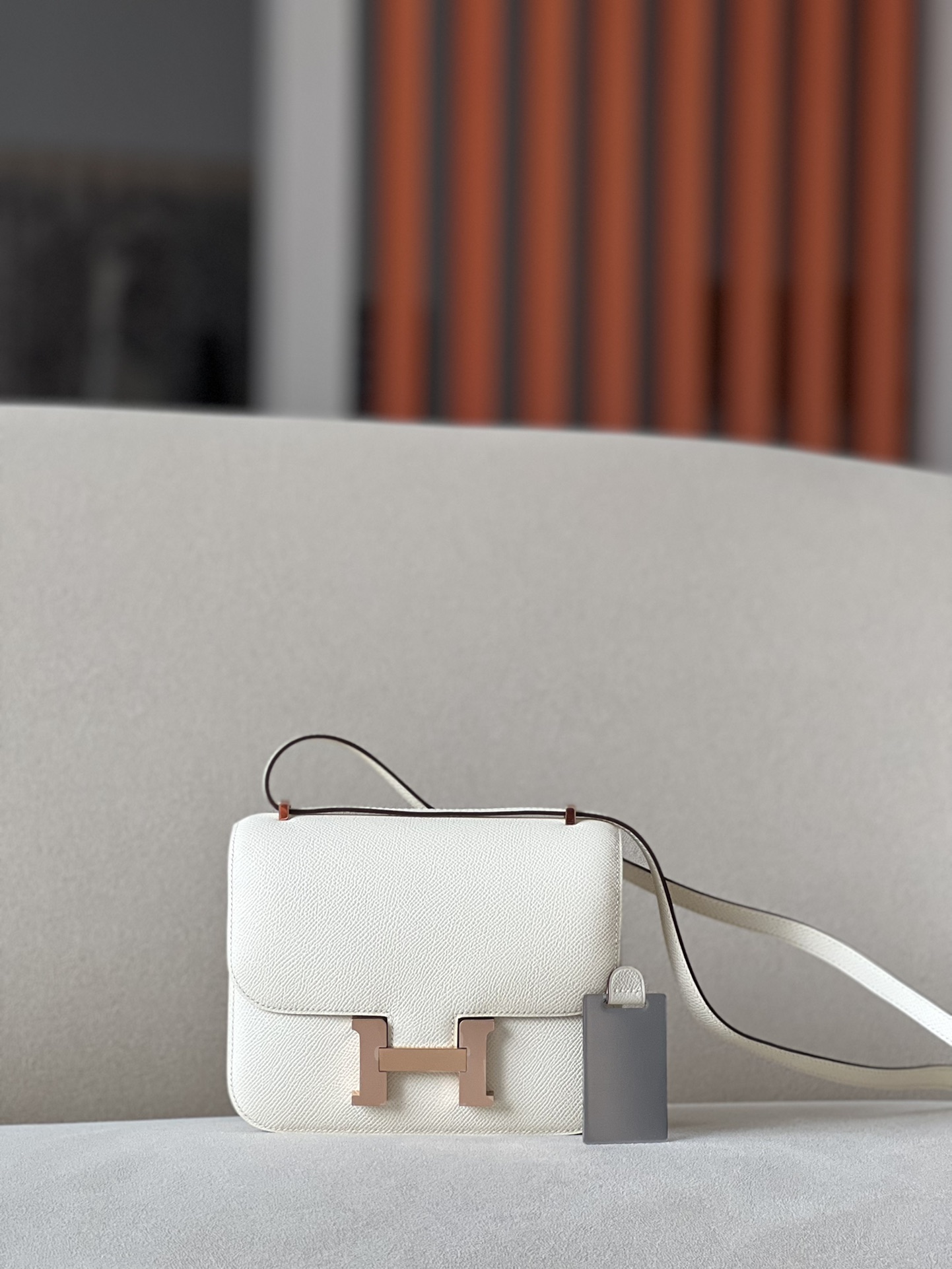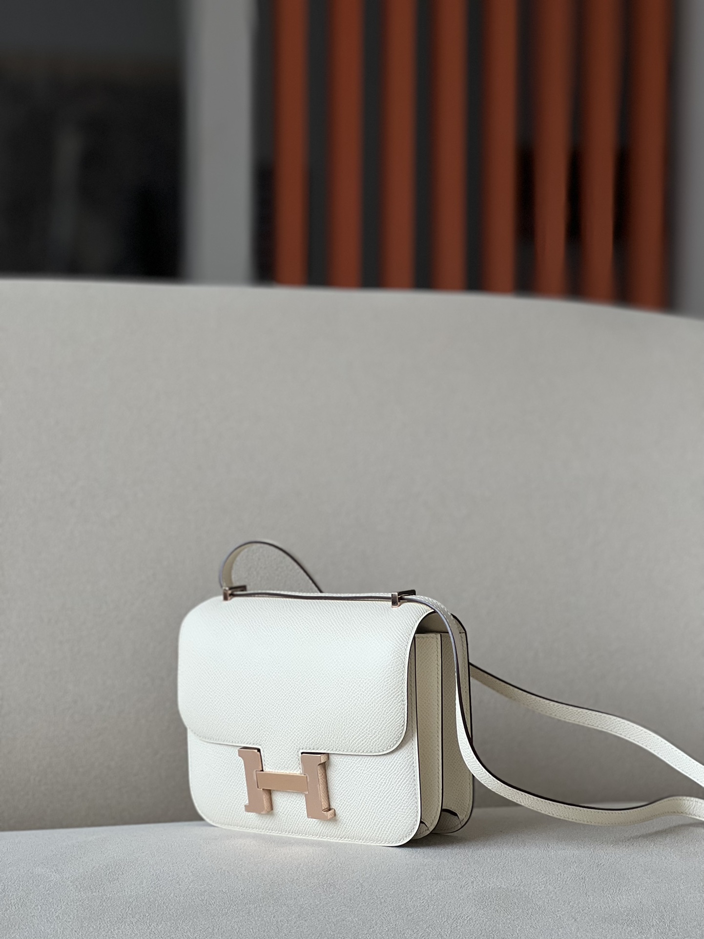 The bag features a long shoulder strap , including an H buckle on the flap.