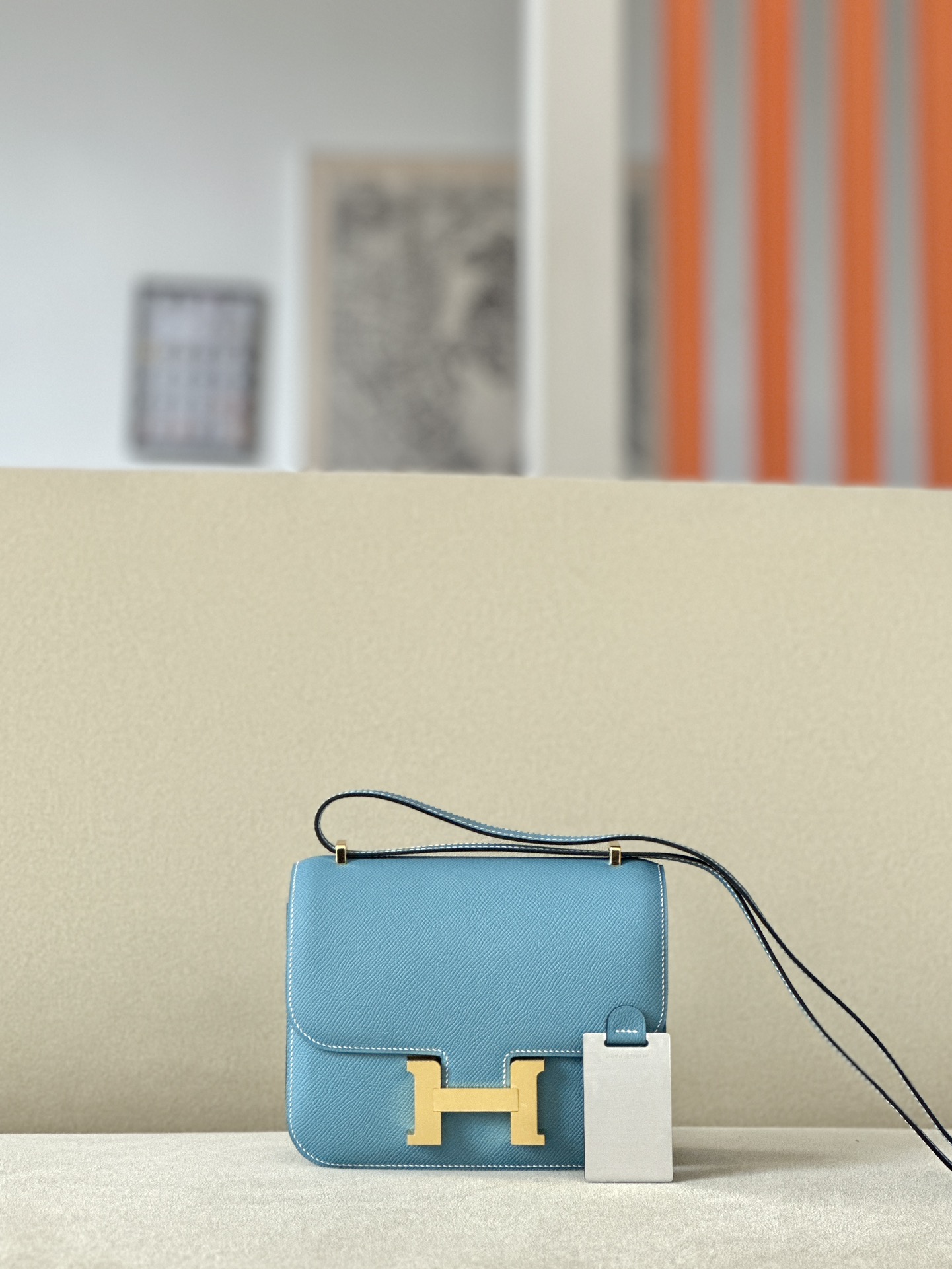 The bag features a long shoulder strap , including an H buckle on the flap.