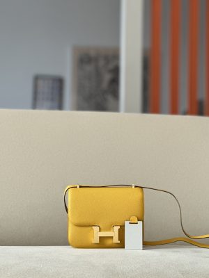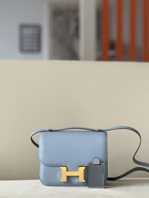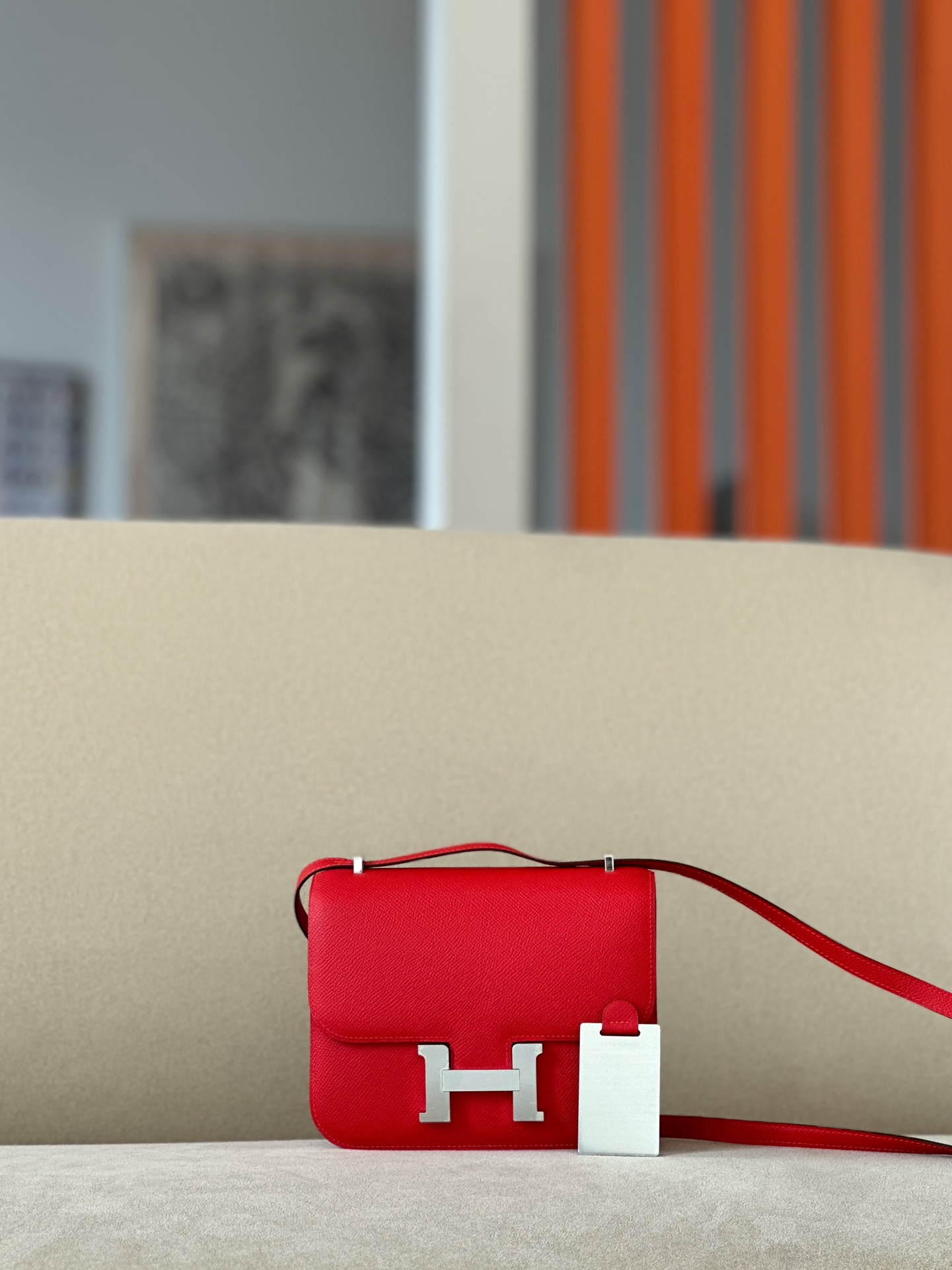 The bag features a long shoulder strap , including an H buckle on the flap.