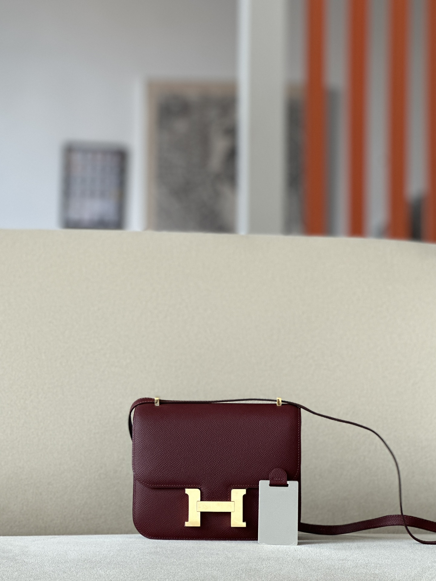 The bag features a long shoulder strap , including an H buckle on the flap.