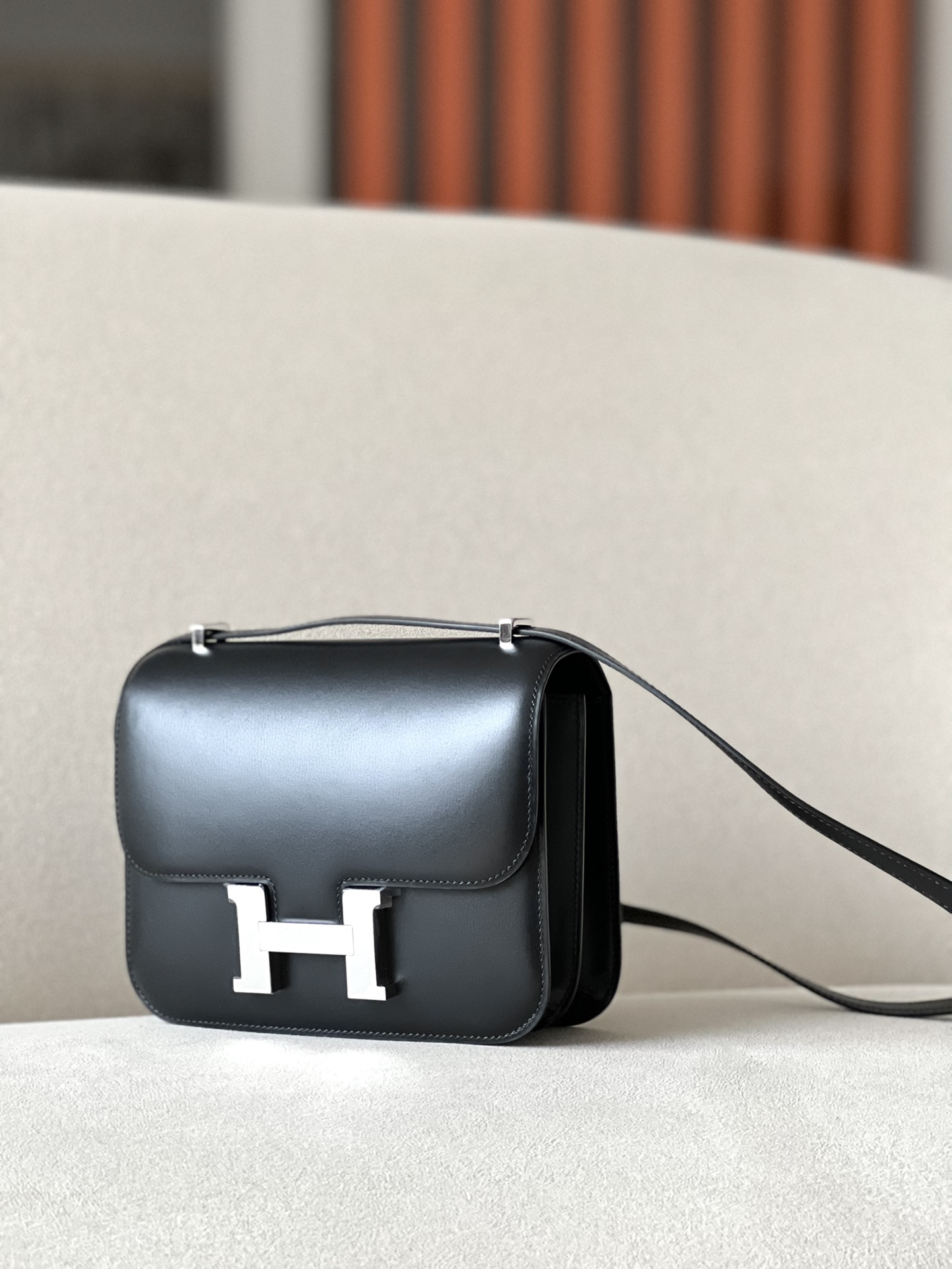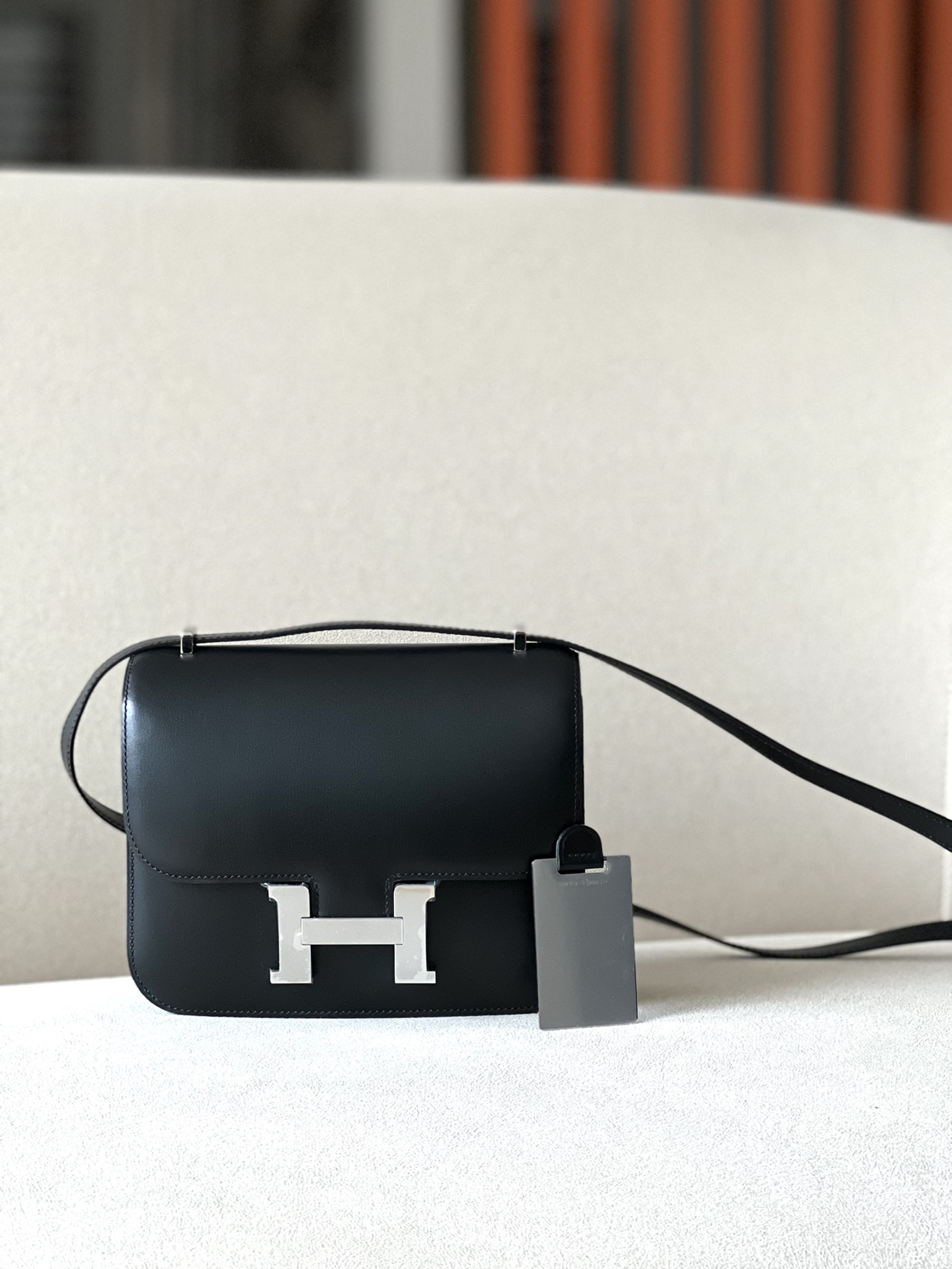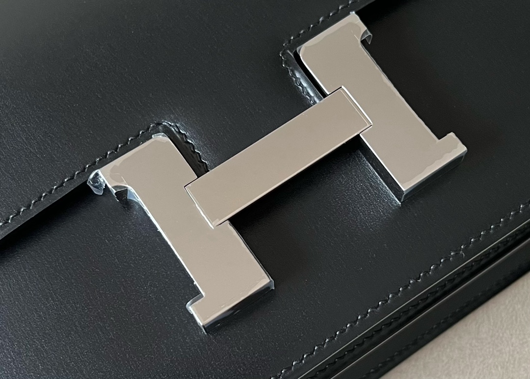“The bag features a long shoulder strap , including an H buckle on the flap.