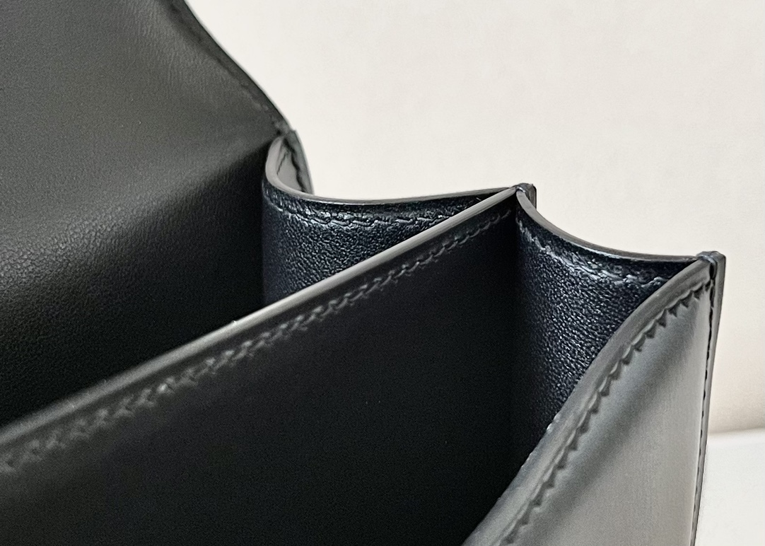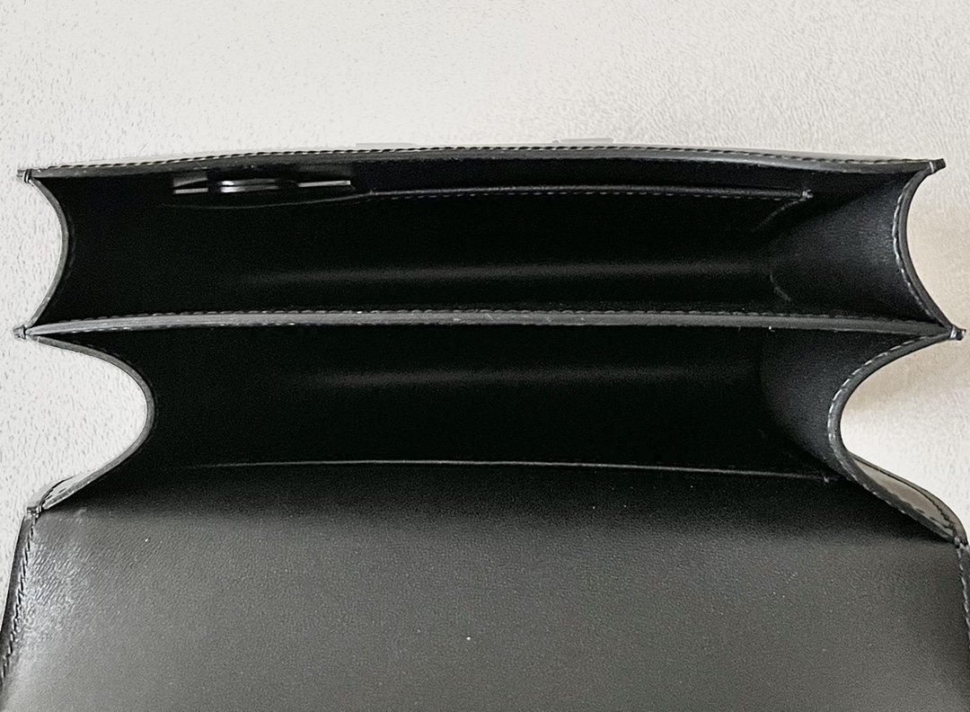 Lining in leather, two compartments, one patch pocket.