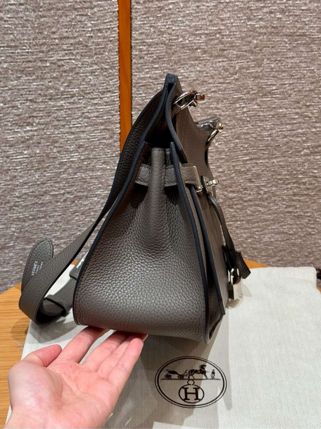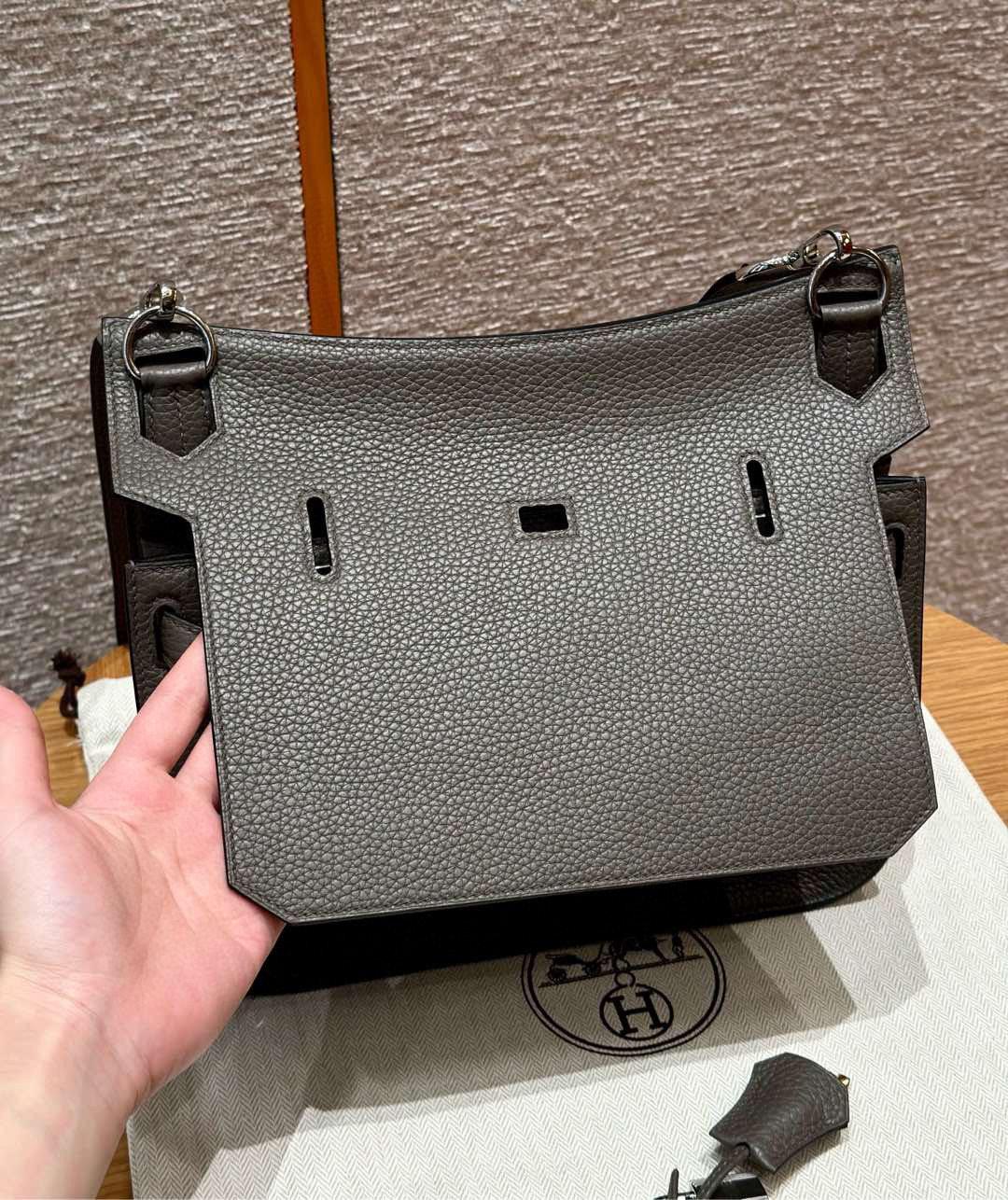 Includes dust bag, ribbon, care booklet, and box