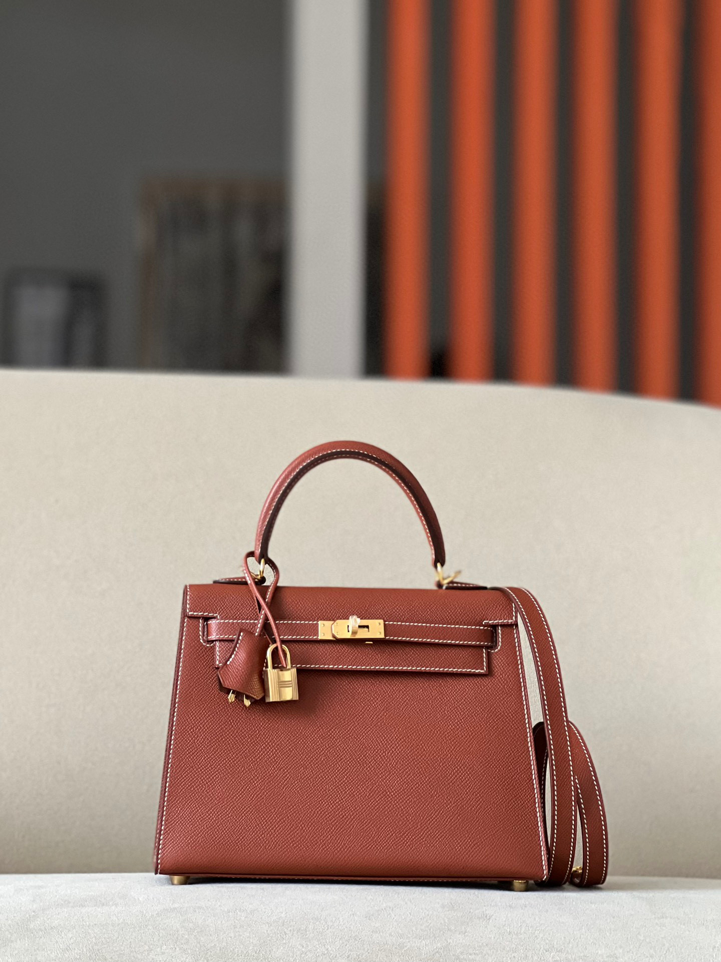 Includes lock, two keys, clochette, clochette dust bag, ribbon, care booklet, raincoat, felt protector, dust bag, and box