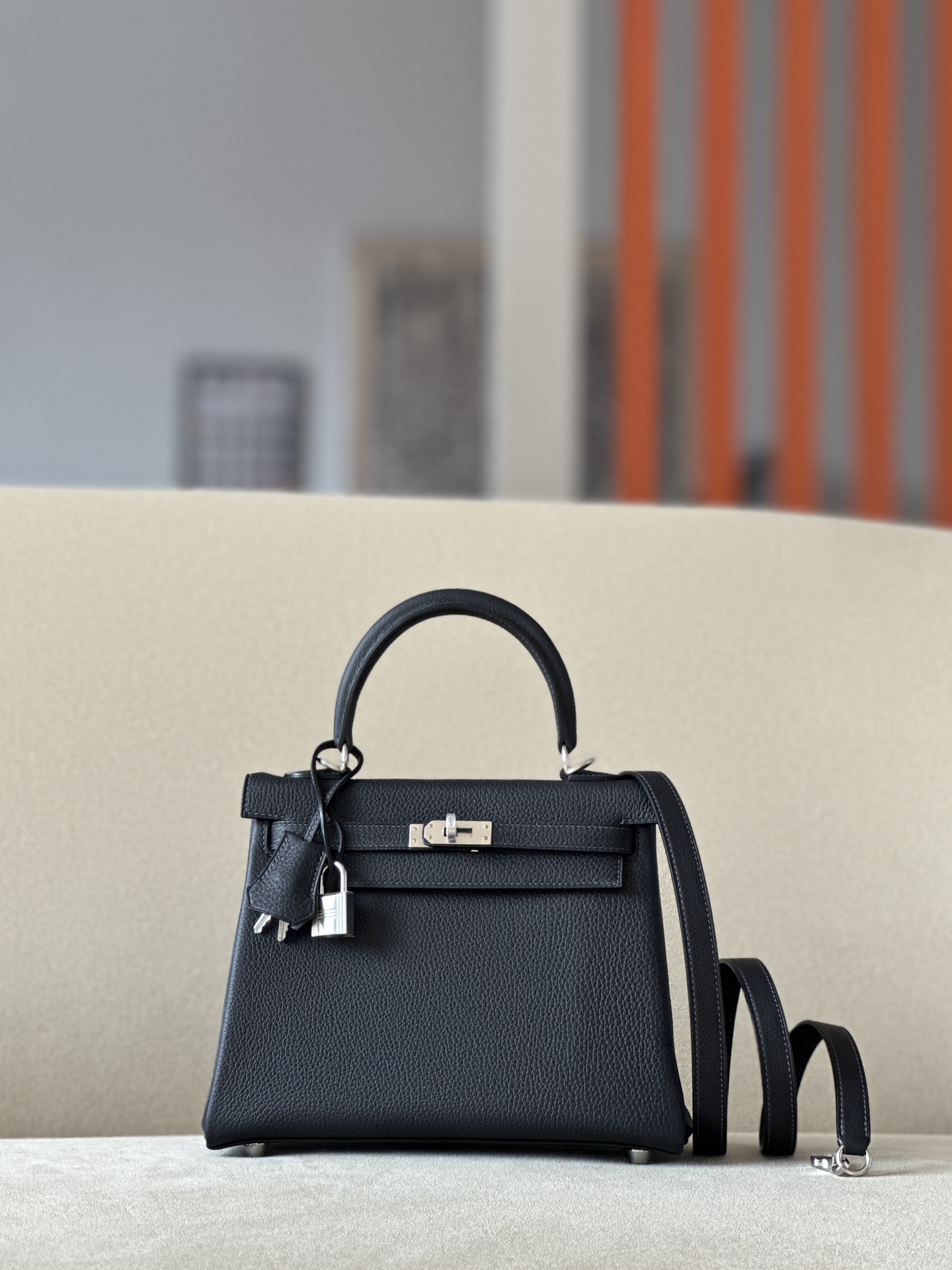 Includes lock, two keys, clochette, clochette dust bag, ribbon, care booklet, raincoat, felt protector, dust bag, and box .