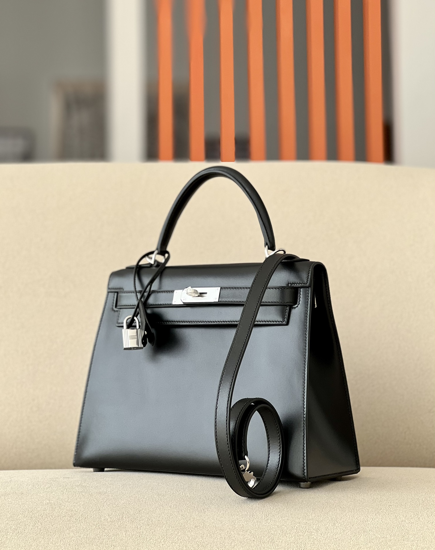 Includes lock, two keys, clochette, clochette dust bag, ribbon, care booklet, raincoat, felt protector, dust bag, and box .