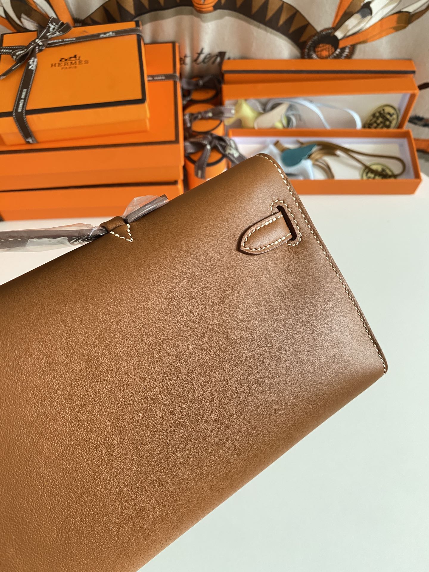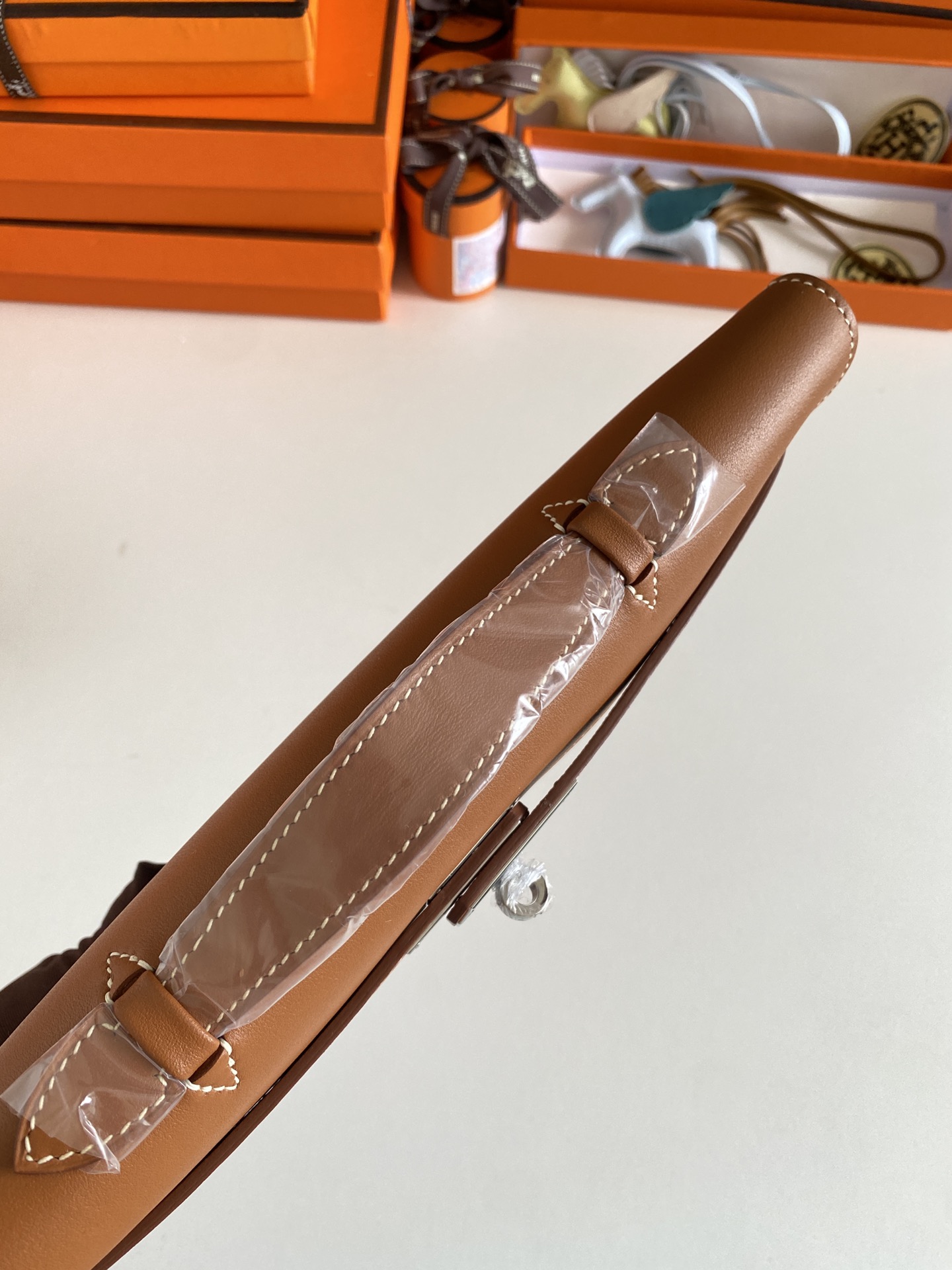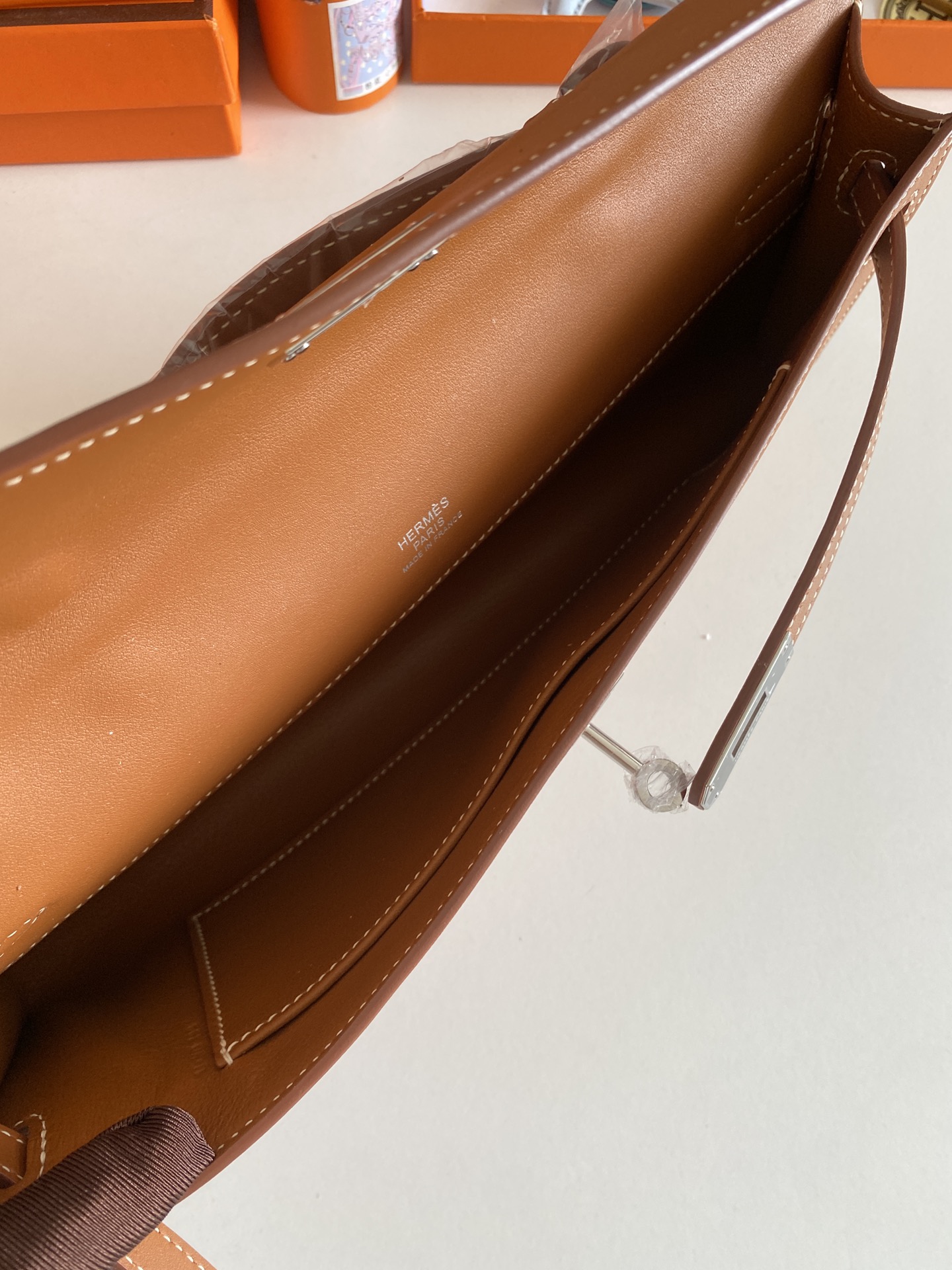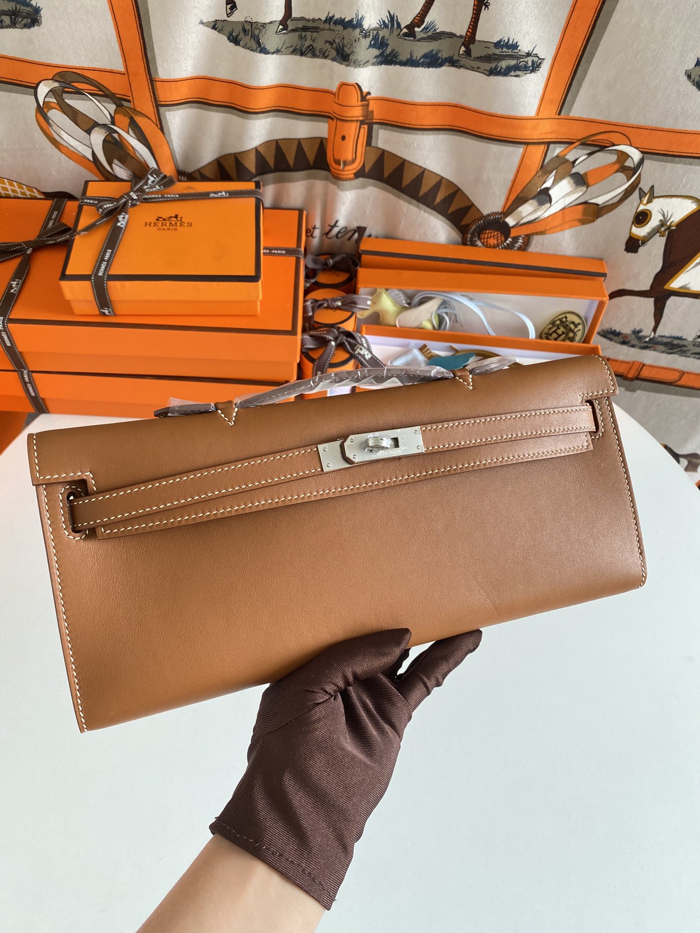 Includes ribbon, care booklet,dust bag, paper bag and box.