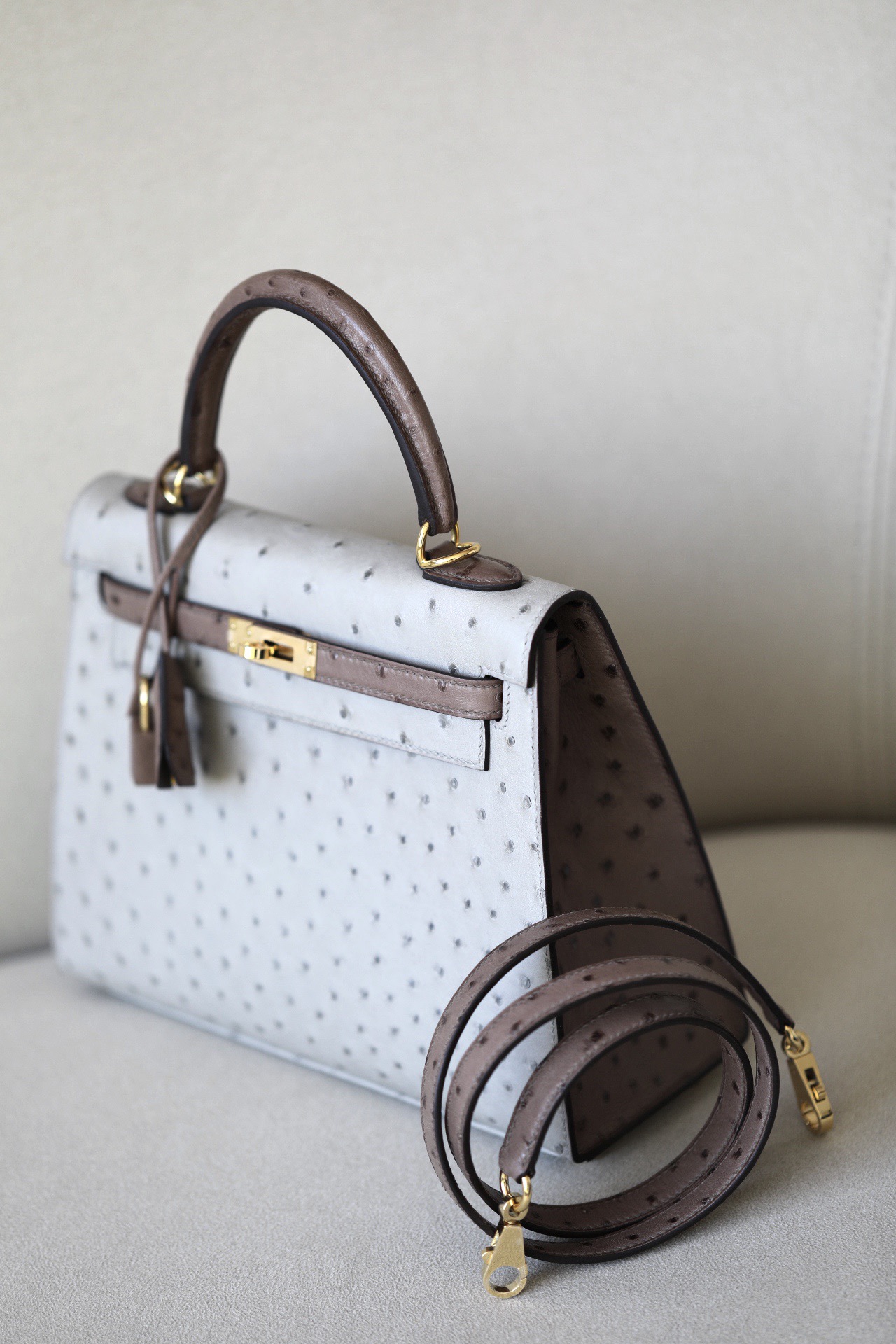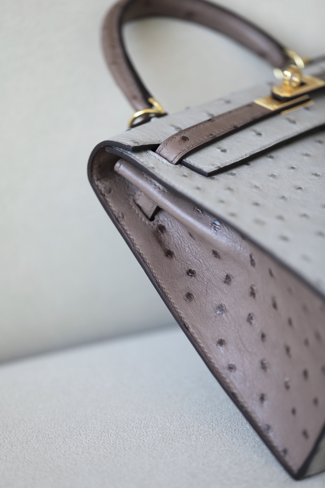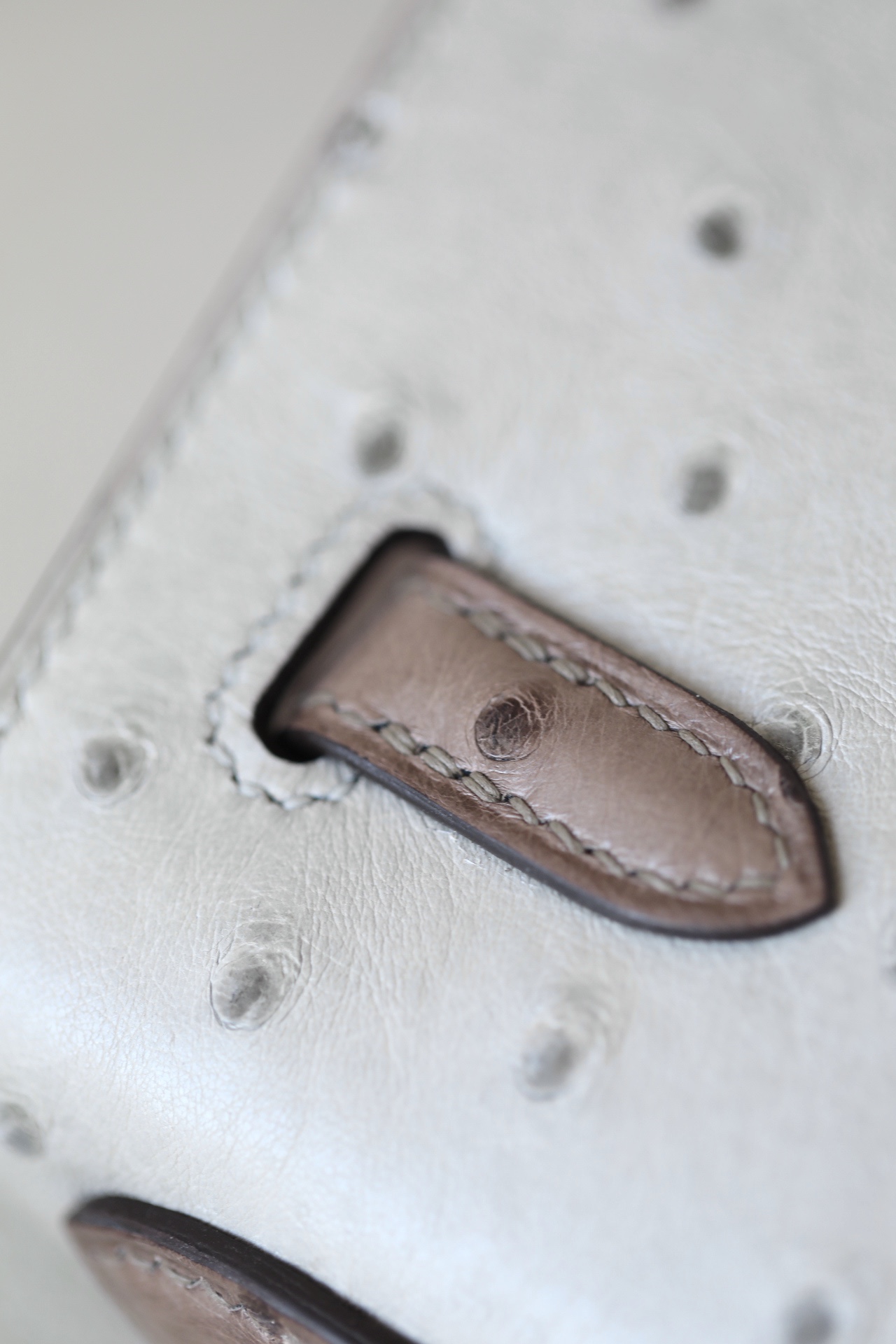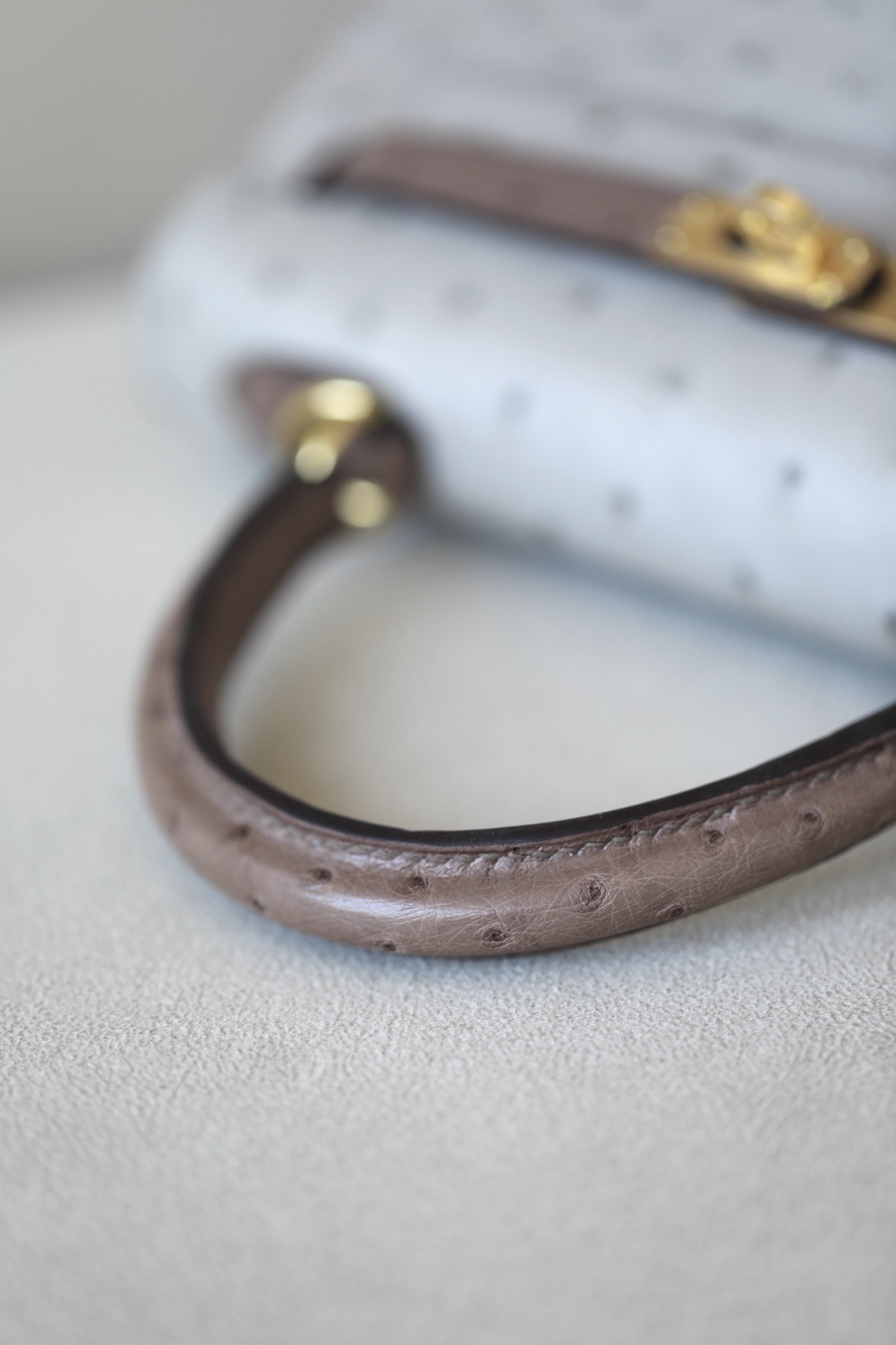 Kelly HSS 25 Ostrich Etoupe(18) and Gris Perle(80) Gold Hardware