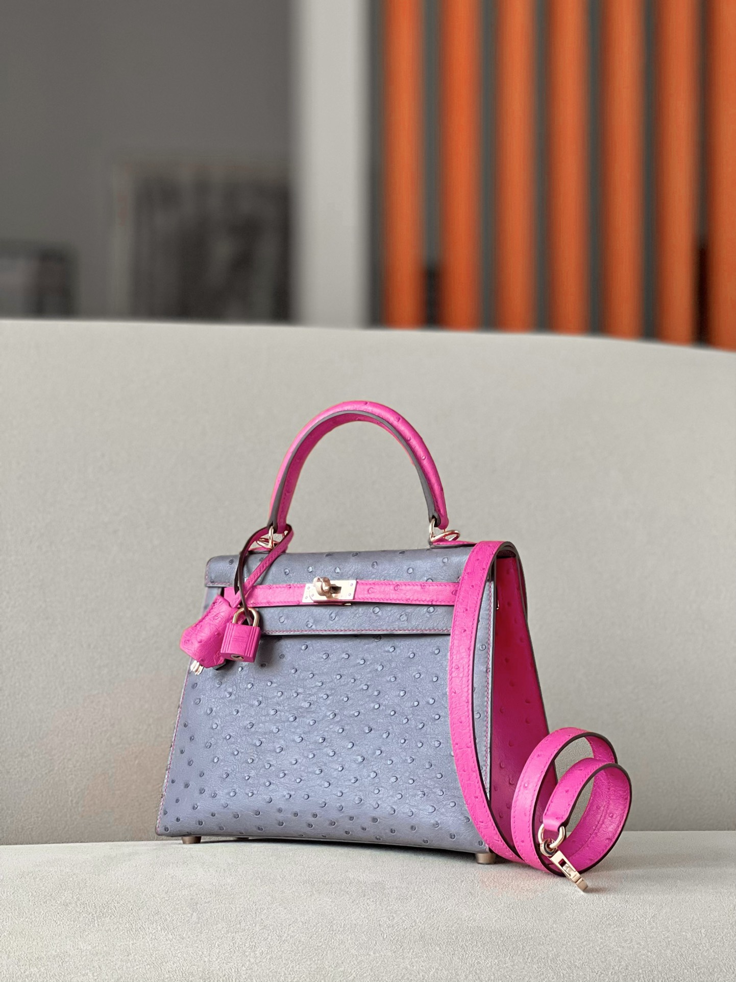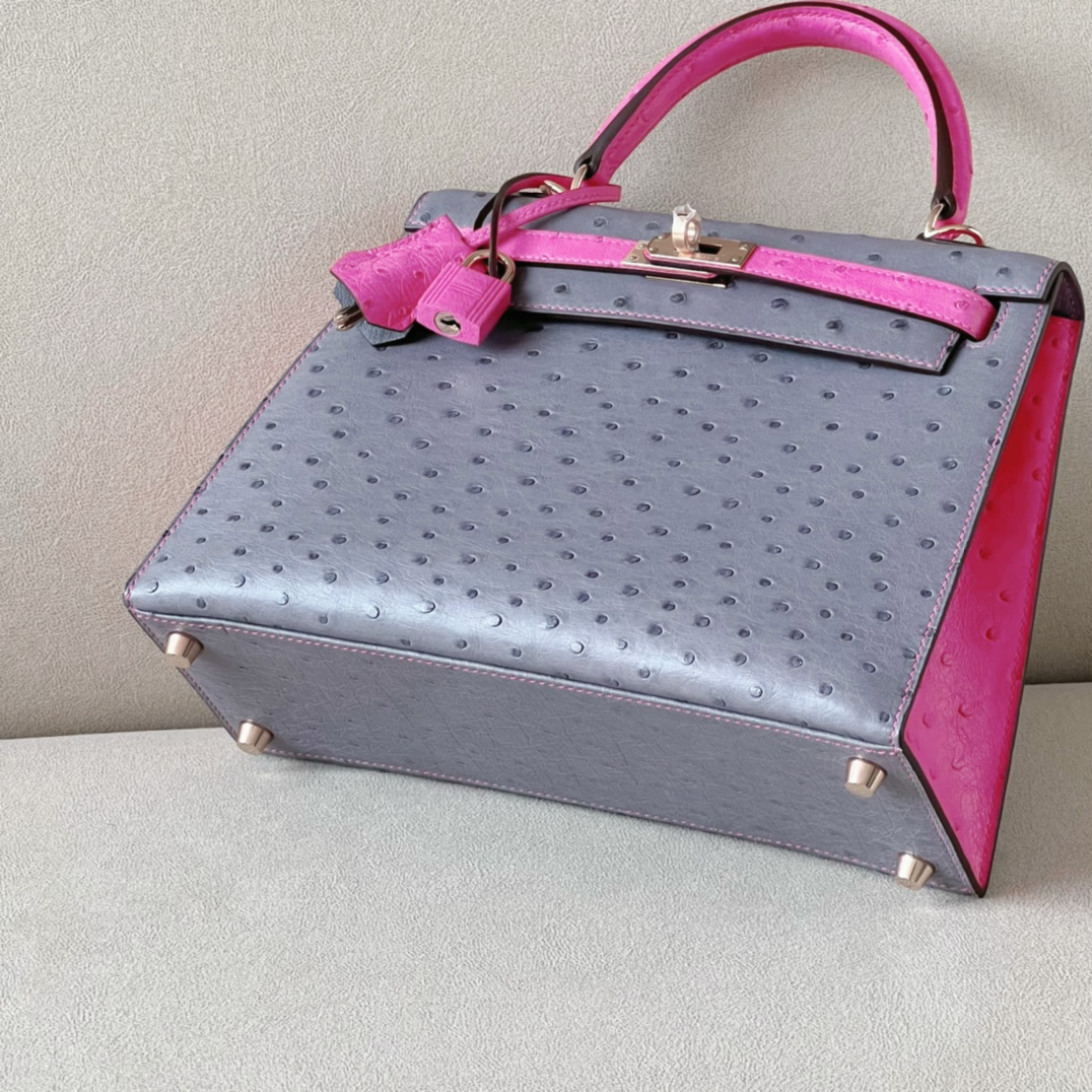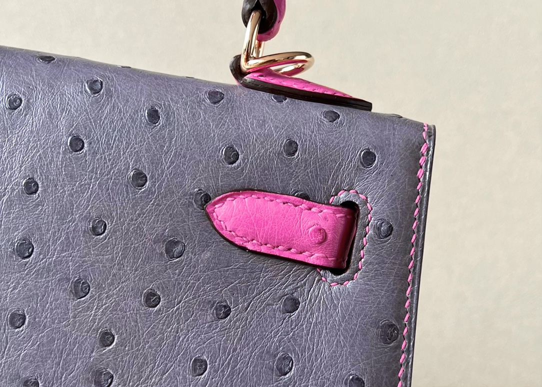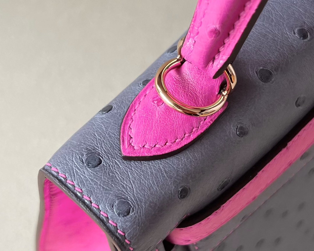 Kelly HSS 25 Ostrich Gris Agate(82) and Rose Tyrien(E5) Rose Gold Hardware
