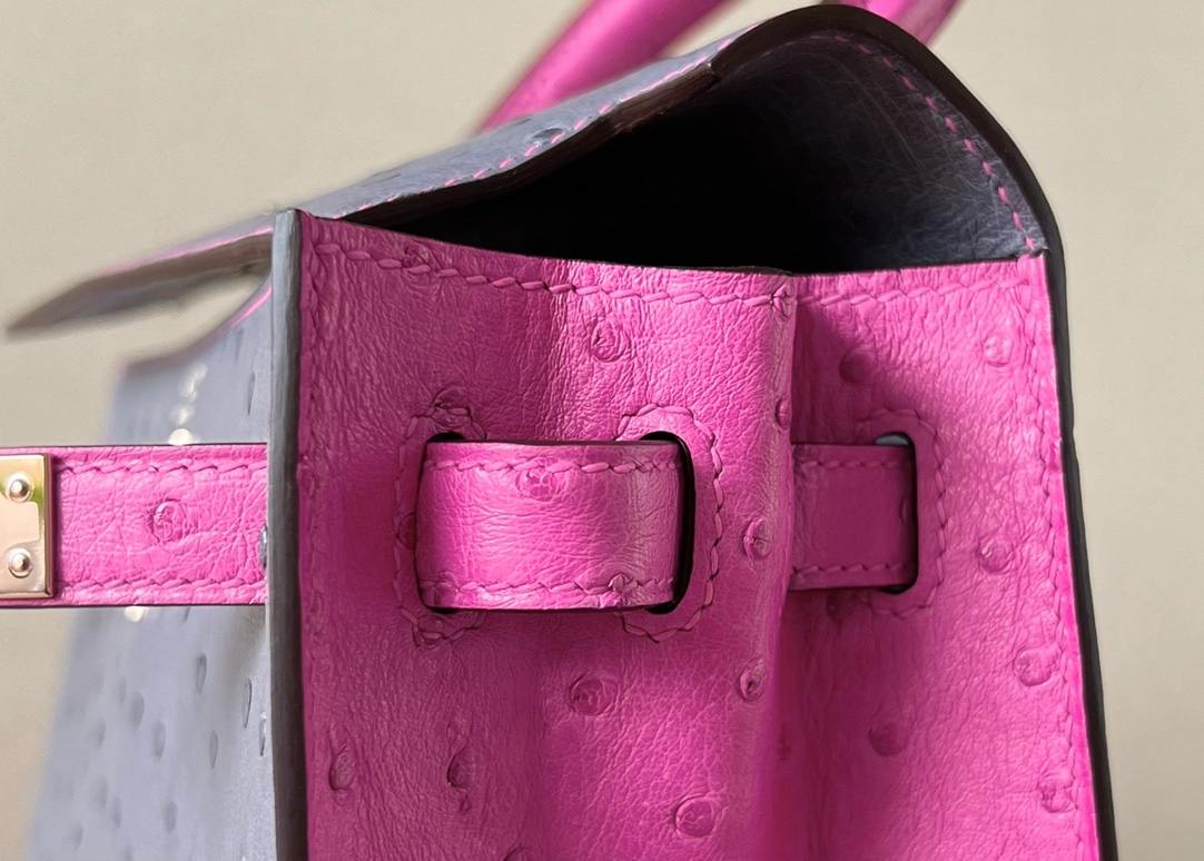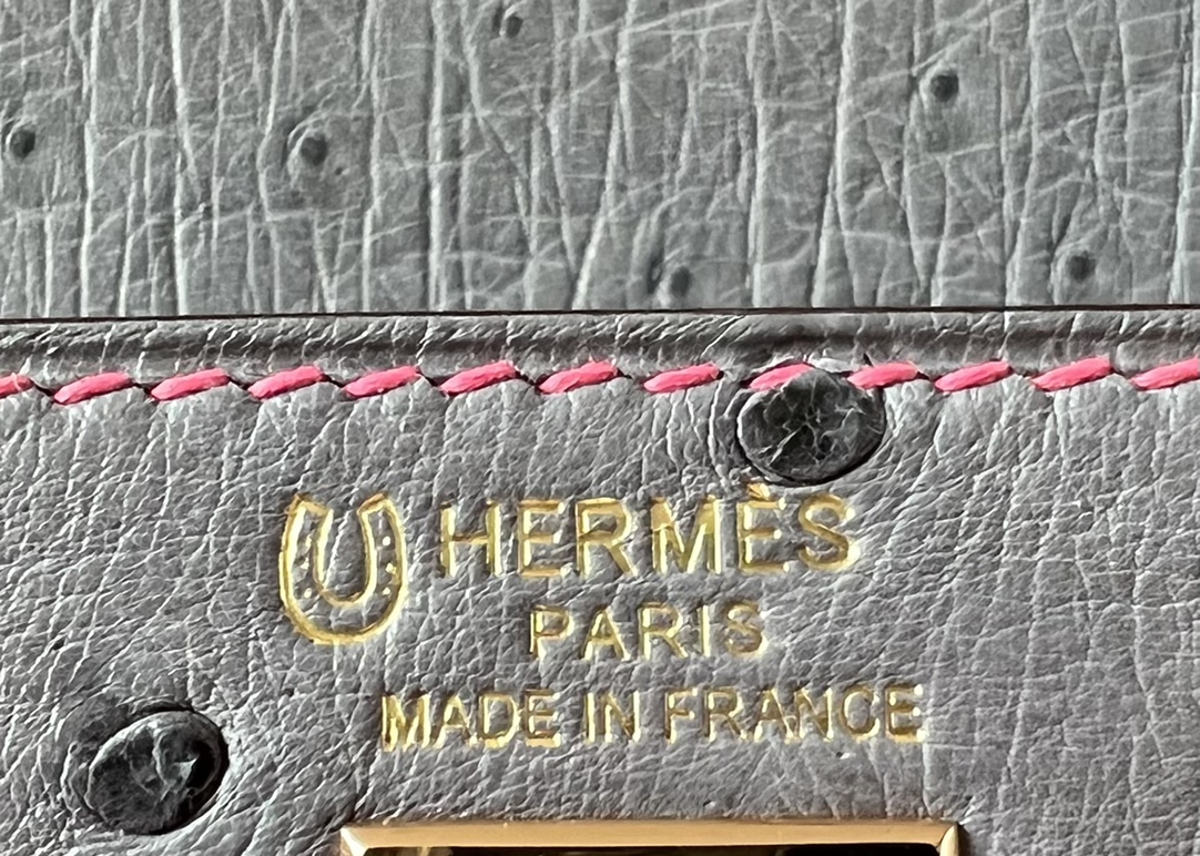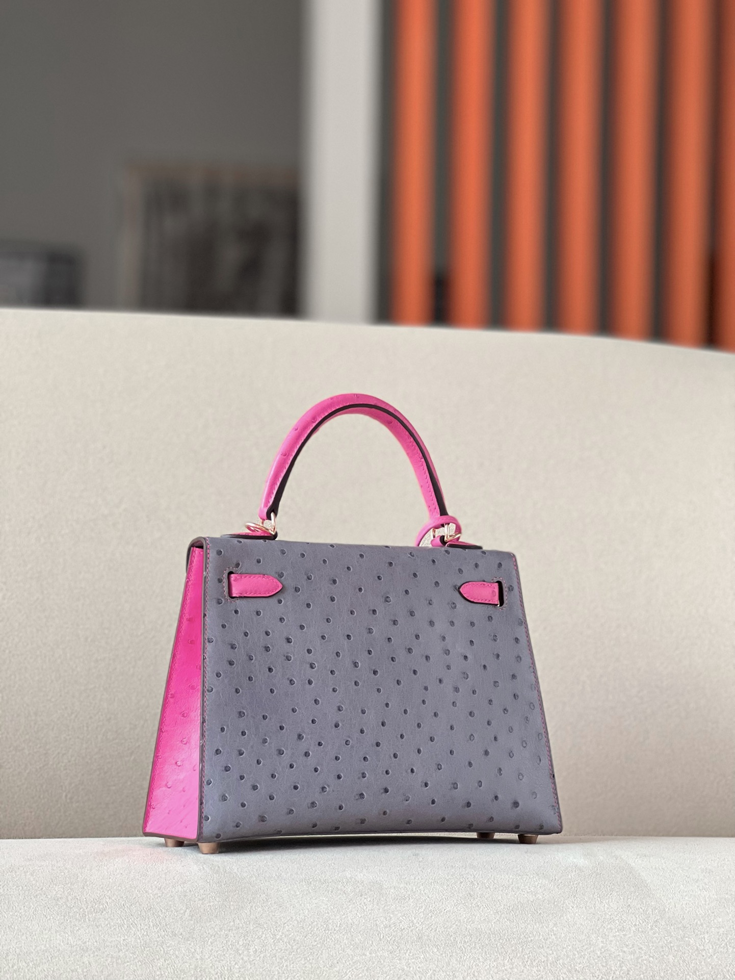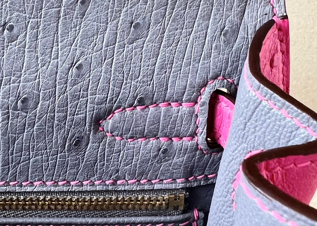 Kelly HSS 25 Ostrich Gris Agate(82) and Rose Tyrien(E5) Rose Gold Hardware