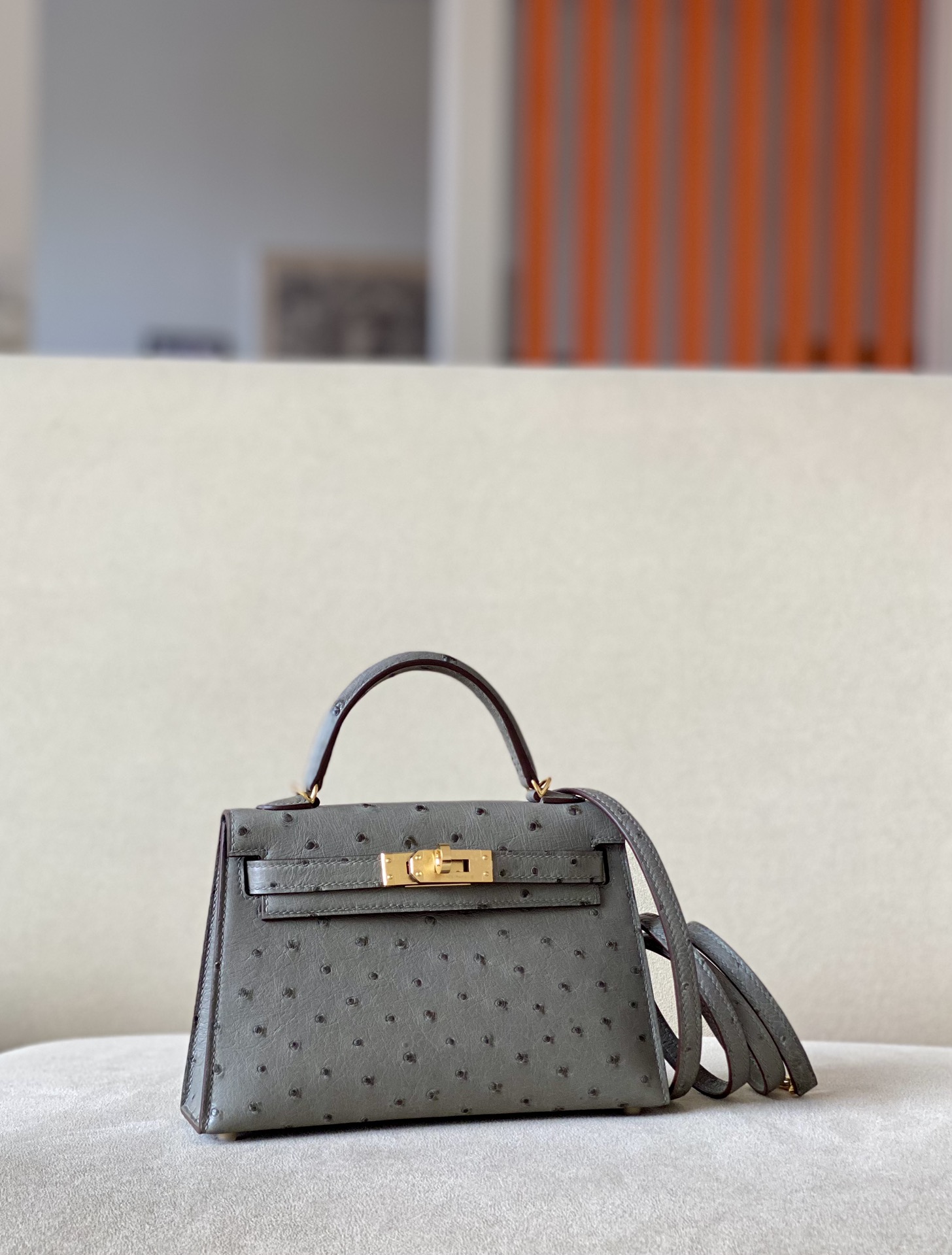 Kelly Mini Ostrich Gris Asphalte (M8) Gold Hardware