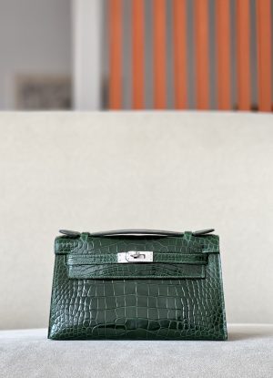 Kelly Pochette Alligator Vert Fonce (67) Palladium Hardware