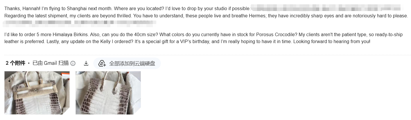 Thanks, Hannah! I’m flying to Shanghai next month. Where are you located? I’d love to drop by your studio if possible. …Regarding the latest shipment, my clients are beyond thrilled. You have to understand, these people live and breathe Hermes; they have incredibly sharp eyes and are notoriously hard to please….