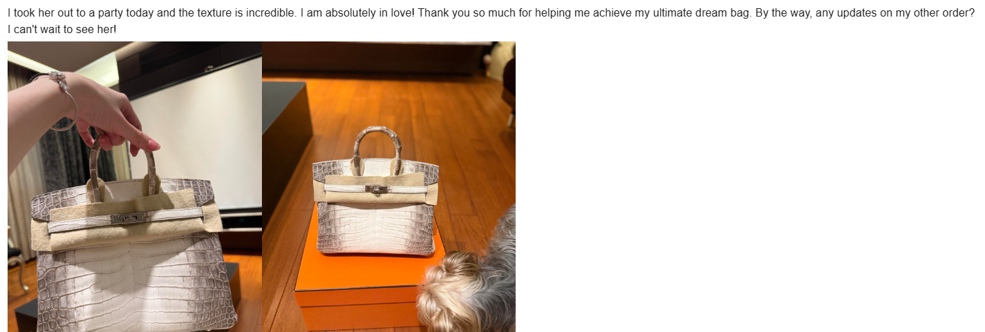 I took her out to a party today and the texture is incredible. I am absolutely in love! Thank you so much for helping me achieve my ultimate dream bag. By the way, any updates on my other order? I can’t wait to see her!