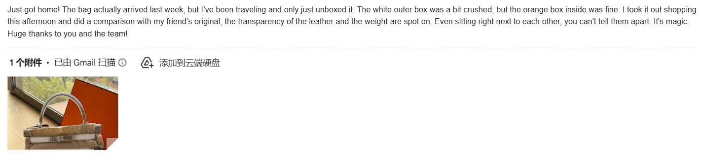 Just got home! The bag actually arrived last week, but I’ve been traveling and only just unboxed it. The white outer box was a bit crushed, but the orange box inside was fine. I took it out shopping this afternoon and did a comparison with my friend’s original, the transparency of the leather and the weight are spot on. Even sitting right next to each other, you can’t tell them apart. It’s magic. Huge thanks to you and the team!